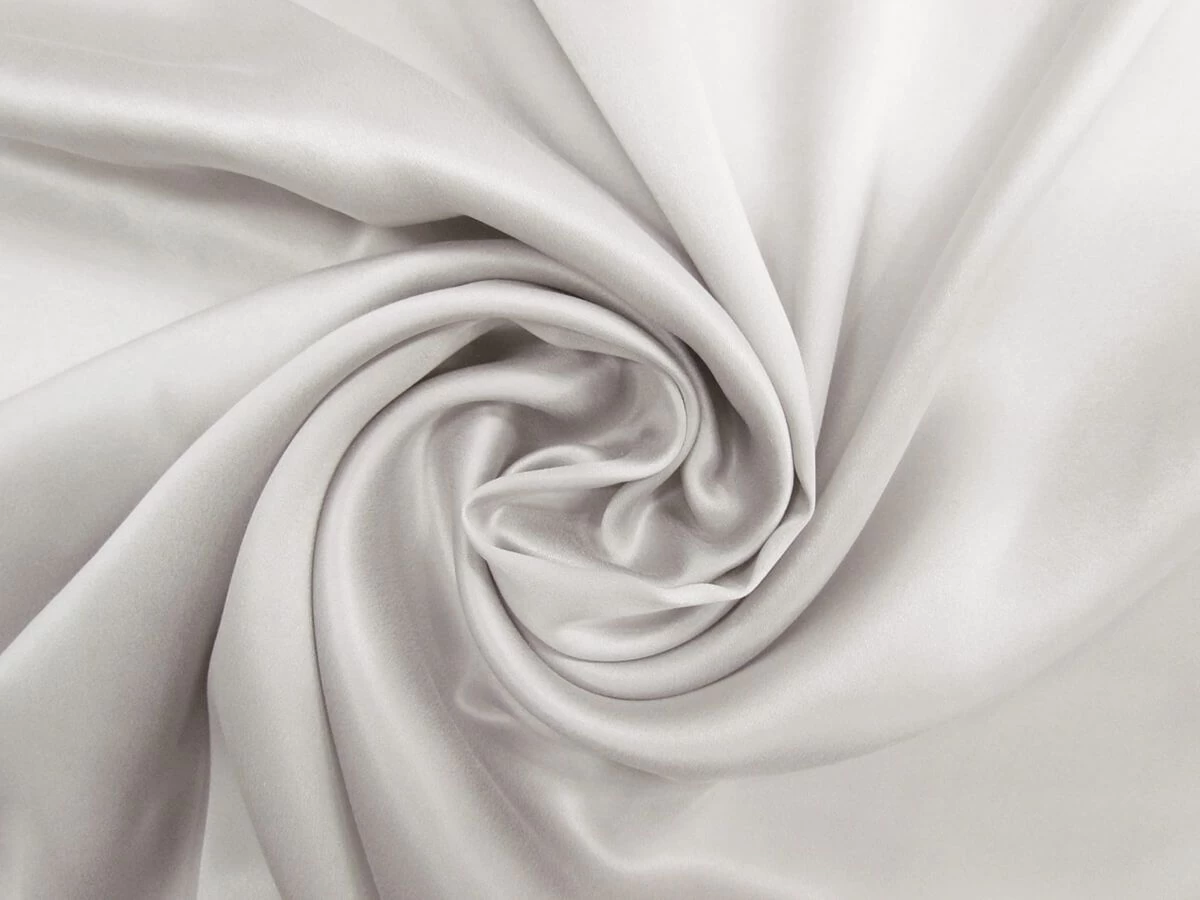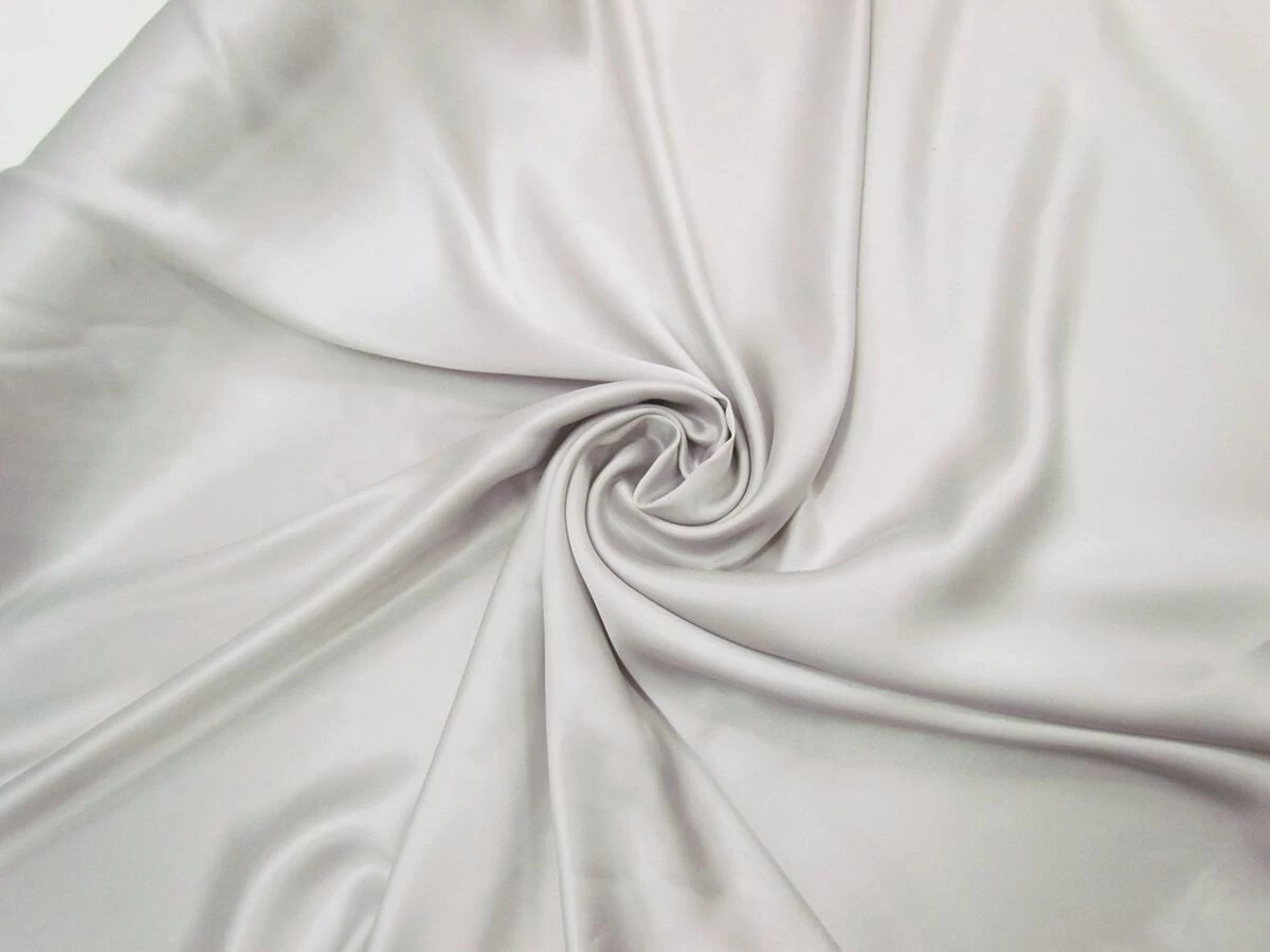 This 100% silk fabric in a light silver grey colour has a sandwashed finish, creating a slightly delustered finish to the right side of the fabric, with the reverse side being more matte and textured. This sandwash silk has great drape and is a semi opaque fabric and may need a lining for certain applications.