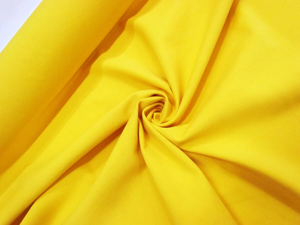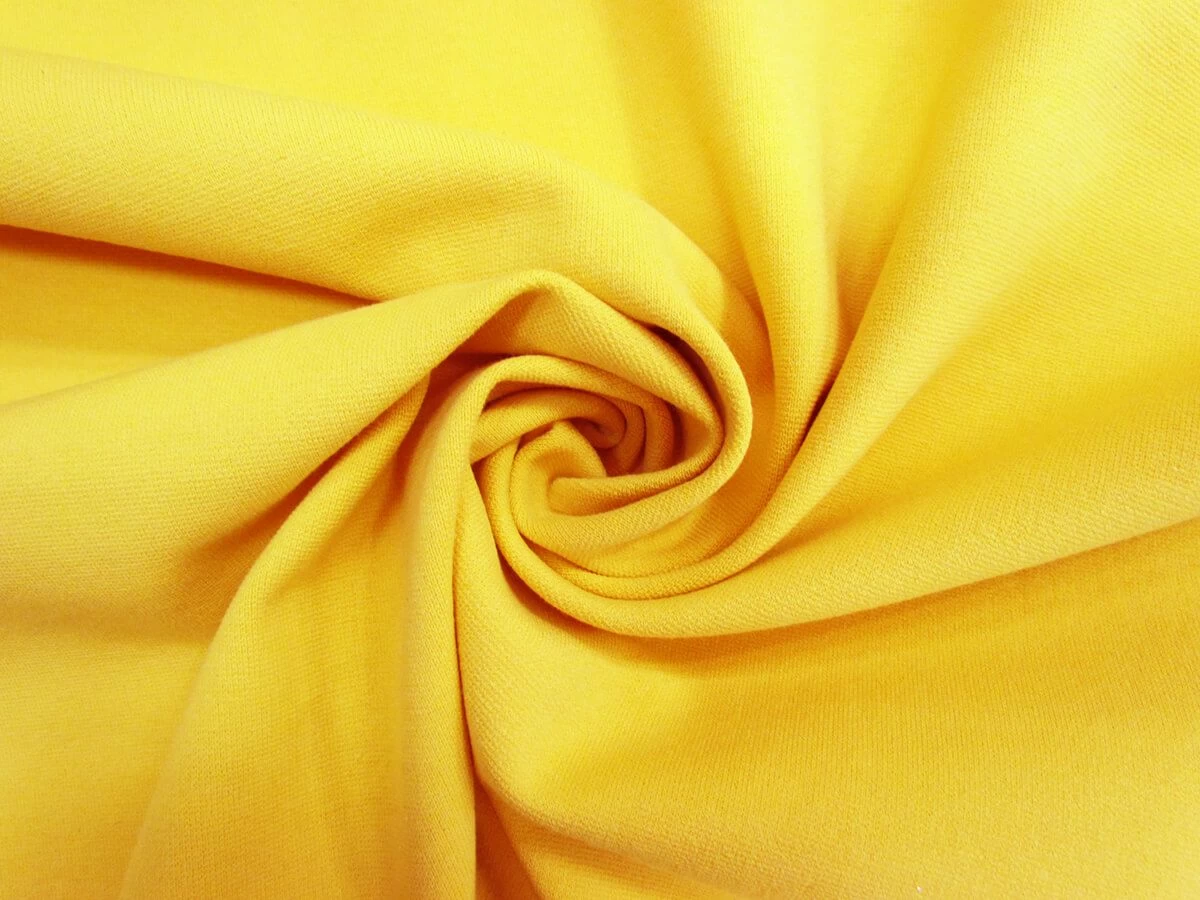 This bright yellow cotton ponte is a heavy weight knit fabric with a soft and comfortable feel. This ponte has great stretch and return along the weft of the fabric and good stretch and return along the warp too. This cotton ponte is an opaque fabric and remains mostly opaque when stretched to its full capacity.