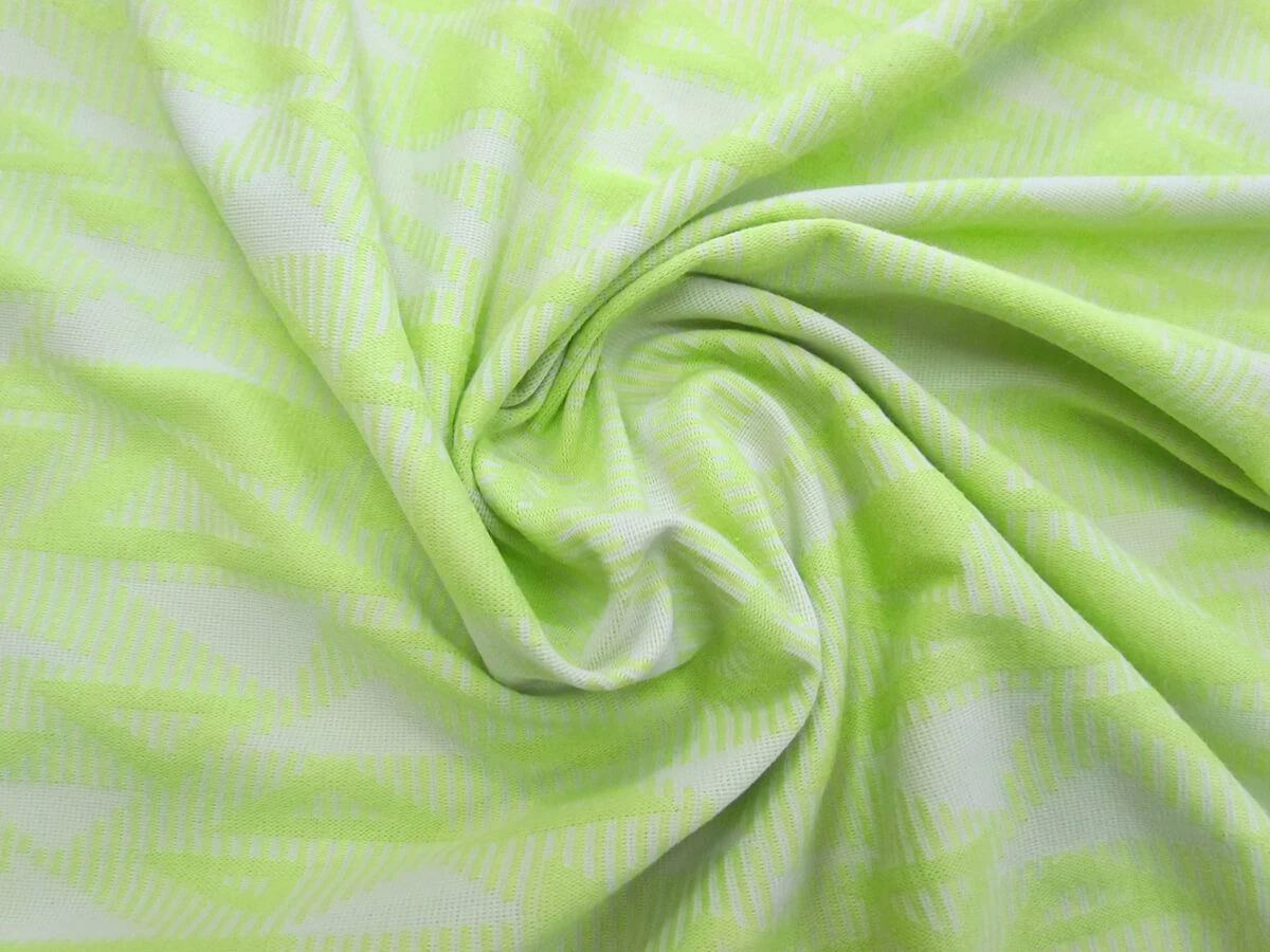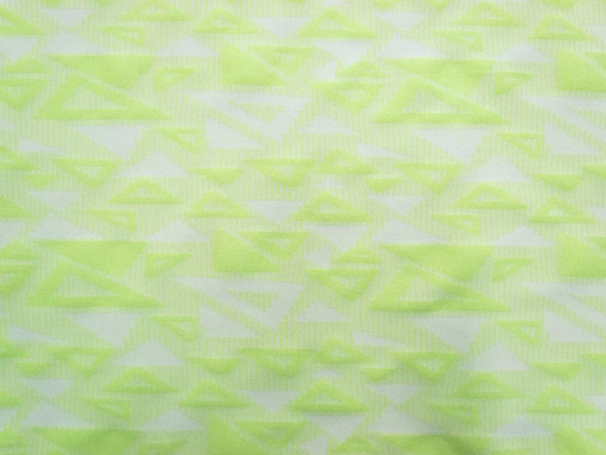 This knit fabric is lovely and soft, with a geometric triangle double knit look. This knit is lightweight, with a comfortable feel. This knit has good stretch and return. Along the weft of the fabric, and no stretch along the warp. This knit fabric is semi-opaque, and does show through, and more when stretched.