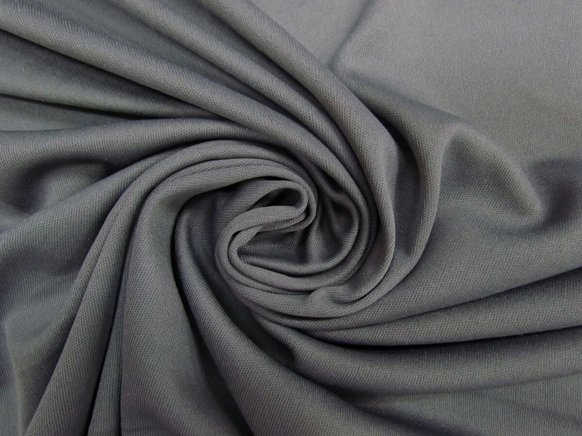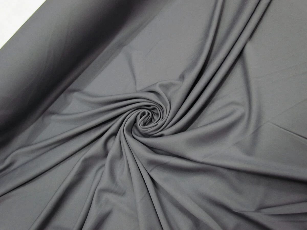 This light weight grey jersey lining has a soft feel and a slightly sheer look. This polyester spandex lining has good degree of stretch and return along the weft of the fabric, with slight stretch along the warp too. This drapey jersey has a slight lustre to it and makes a great lining for a stretch garment.