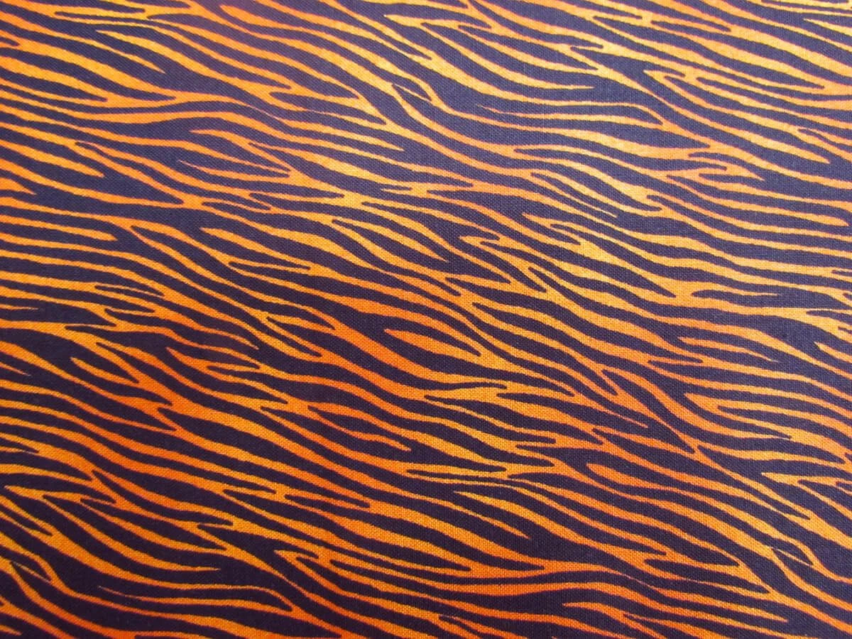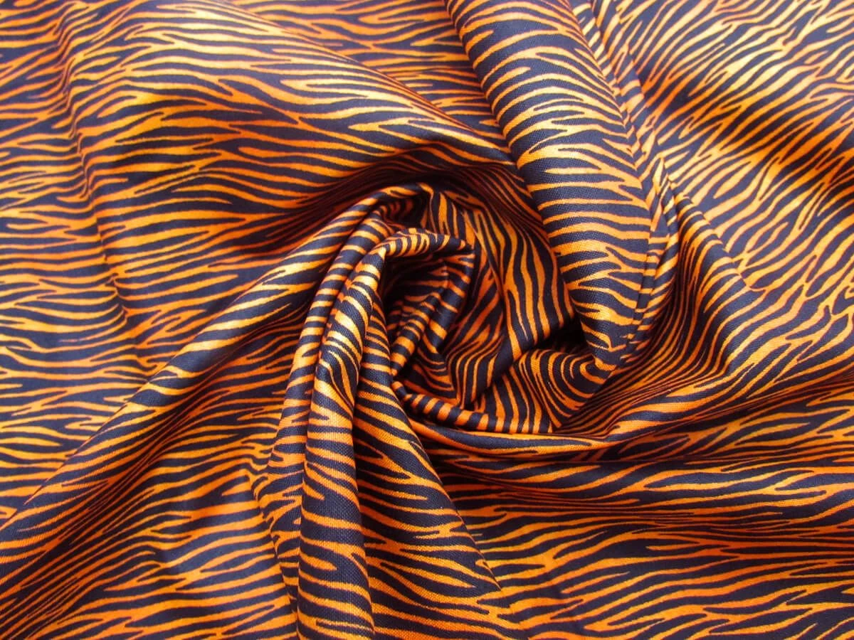 This is a 100% cotton fabric, with a comfortable feel. This fabric feels lightweight in hand, and is suitable for quilting and patchwork projects. The woven cotton fabric is also suitable for other projects, including clothing, crafts, and accessories. This fabric is nearly opaque, with some slight showing through due to the lightness, and a lining may be desired for some garment uses. This orange toned animal print cotton is called a zebra print by the designer, and could also work as a tiger print.