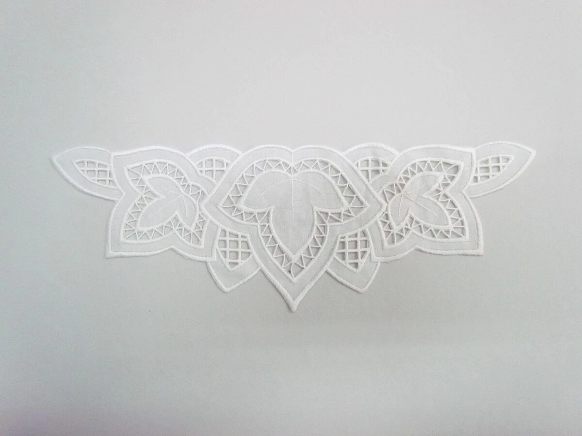 This motif is designed to be attached to apparel or other projects as a motif. This motif measures approximately 31cm in width and 9cm in height and features a beautiful leaf design.