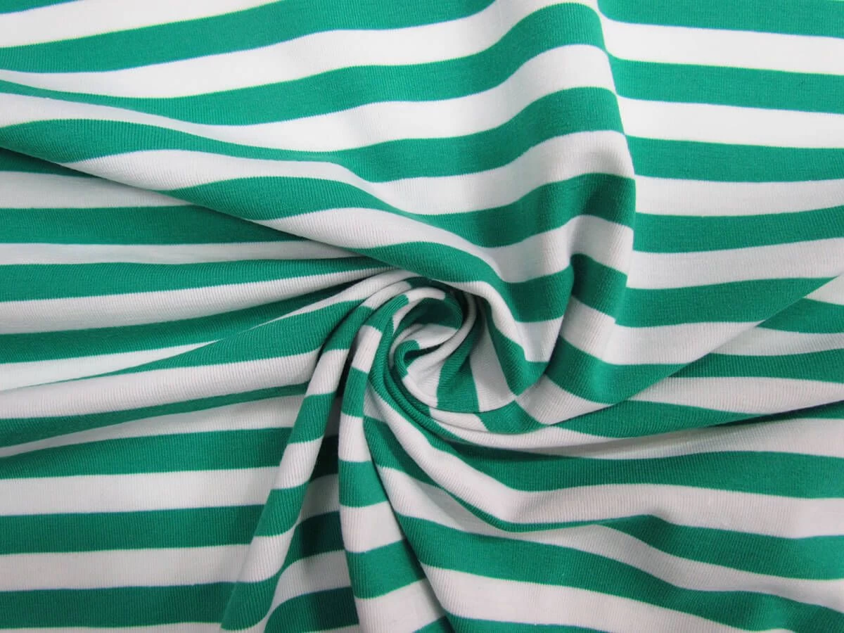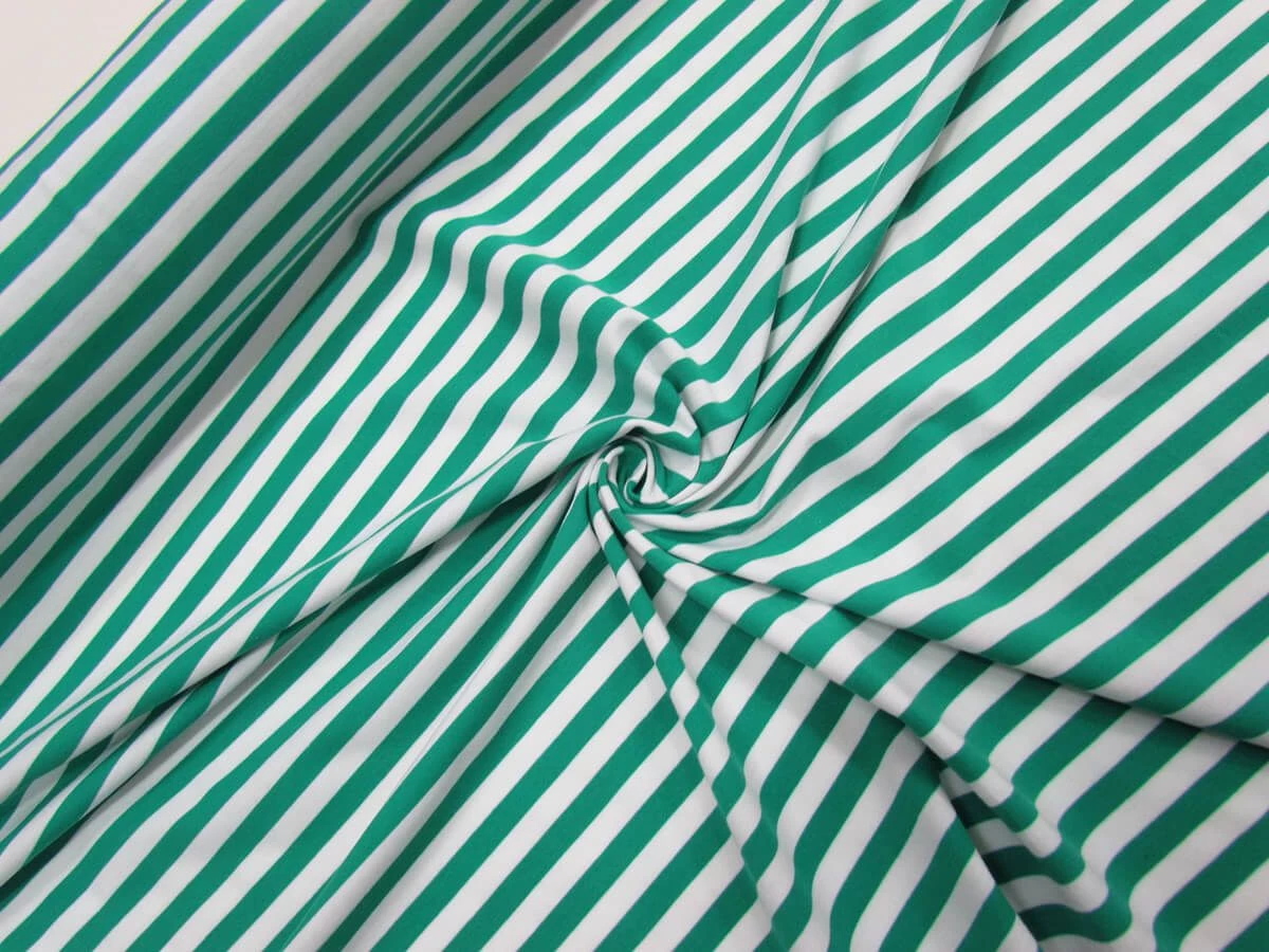 This teal and white stripe spandex is made from a blend of cotton, polyester and spandex to create a medium weight, soft fabric and has stripes that measure approximately 10mm in width. This New Zealand made spandex has an excellent degree of two way stretch and return. This is an opaque fabric, however does sheer when stretched, due to this a lining may be desired for some applications.