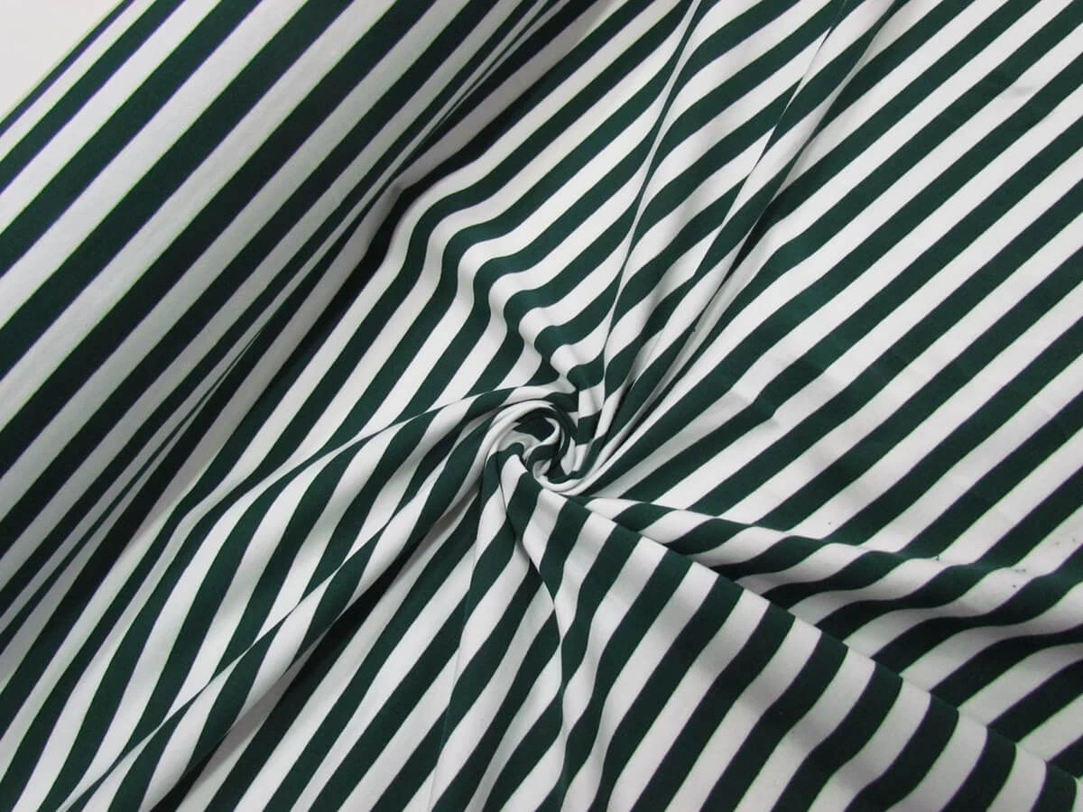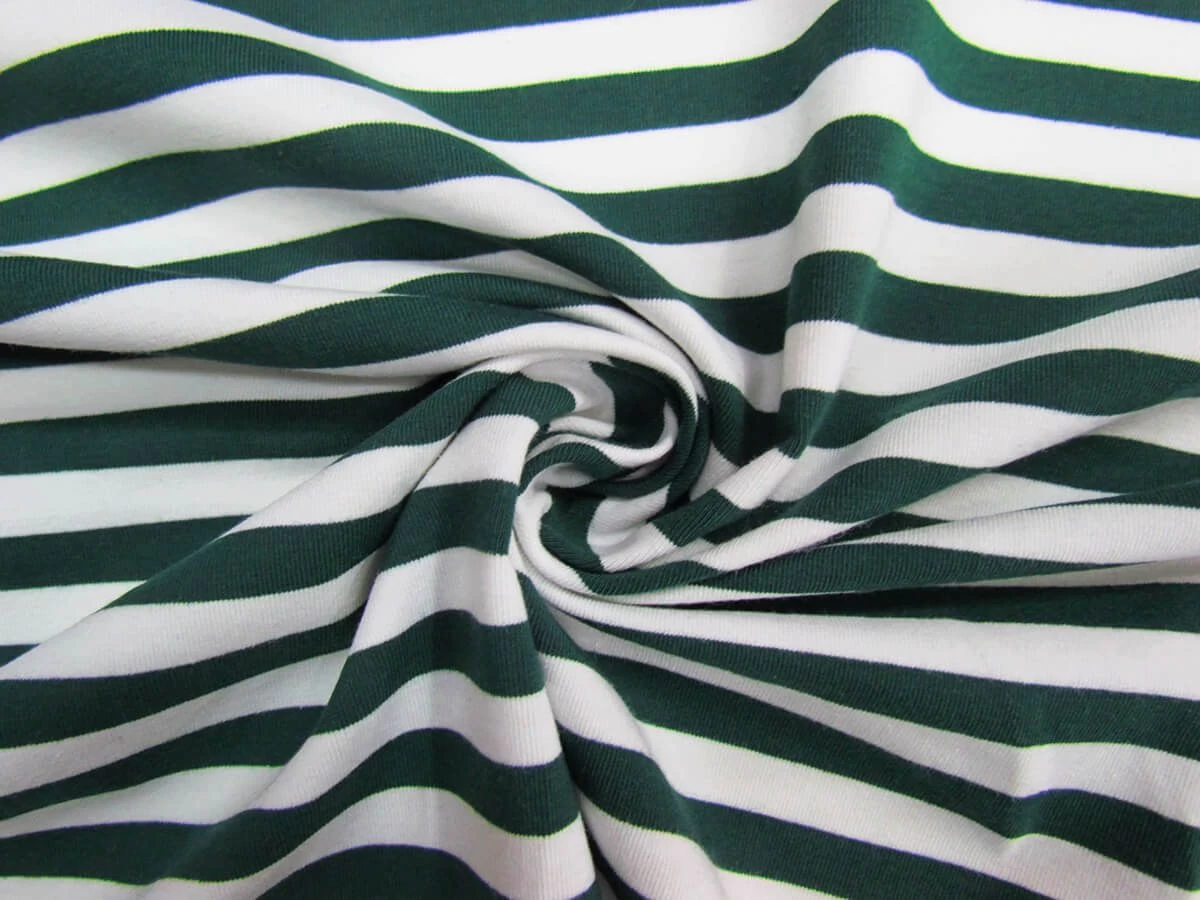 This green and white stripe spandex is made from a blend of cotton, polyester and spandex to create a medium weight, soft fabric and has stripes that measure approximately 9mm in width. This New Zealand made spandex has an excellent degree of two way stretch and return. This is an opaque fabric, however does sheer when stretched, due to this a lining may be desired for some applications.