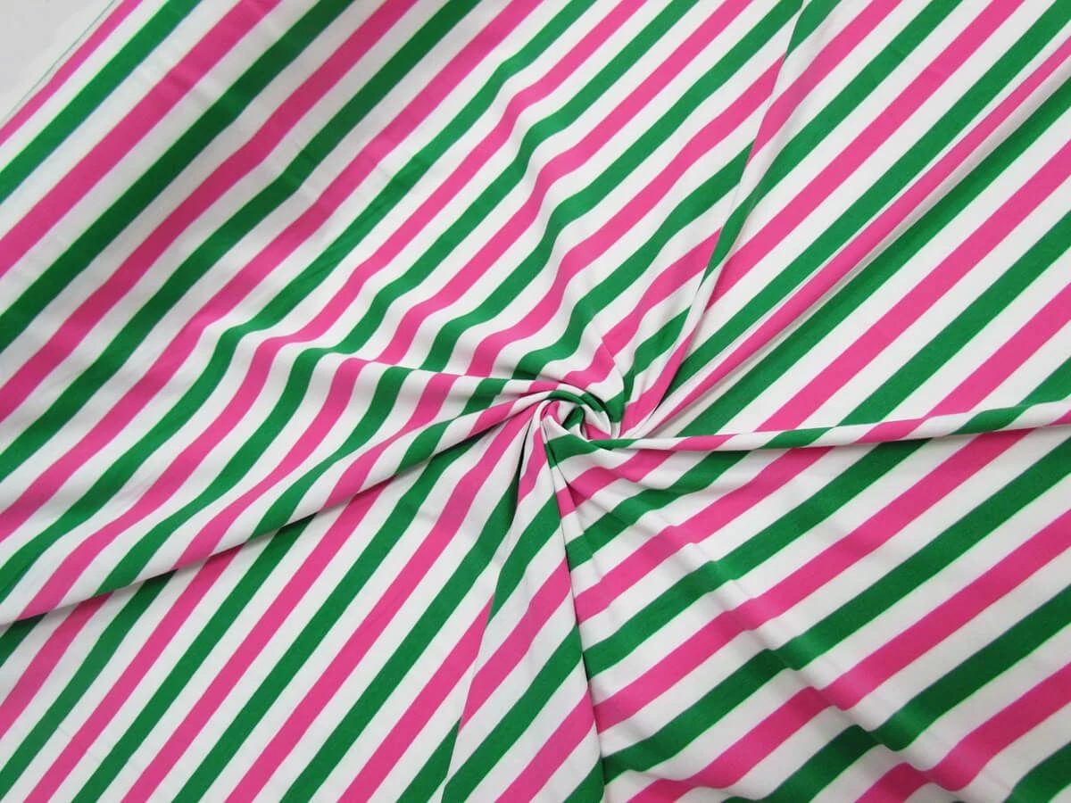 This pink, green and white stripe spandex is made from a blend of cotton, polyester and spandex to create a medium weight, soft fabric and has stripes that measure approximately 12mm in width. This New Zealand made spandex has an excellent degree of two way stretch and return. This is an opaque fabric, however does sheer when stretched, due to this a lining may be desired for some applications.