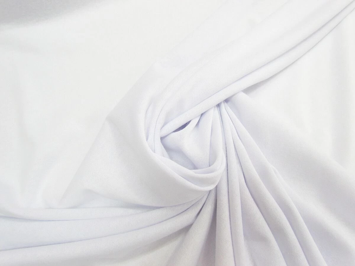 This plain white fabric has a soft knit feel, with a fine terry unbrushed underside. The face of this fleece also has a smooth knitted look. This fleece knit fabric has some stretch and return along the weft of the fabric. This is a lightweight terry knit, that is not fully opaque, and does show through.