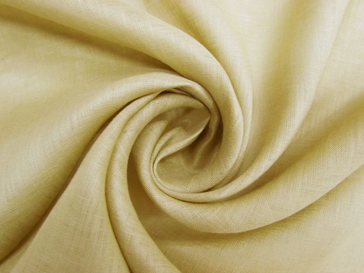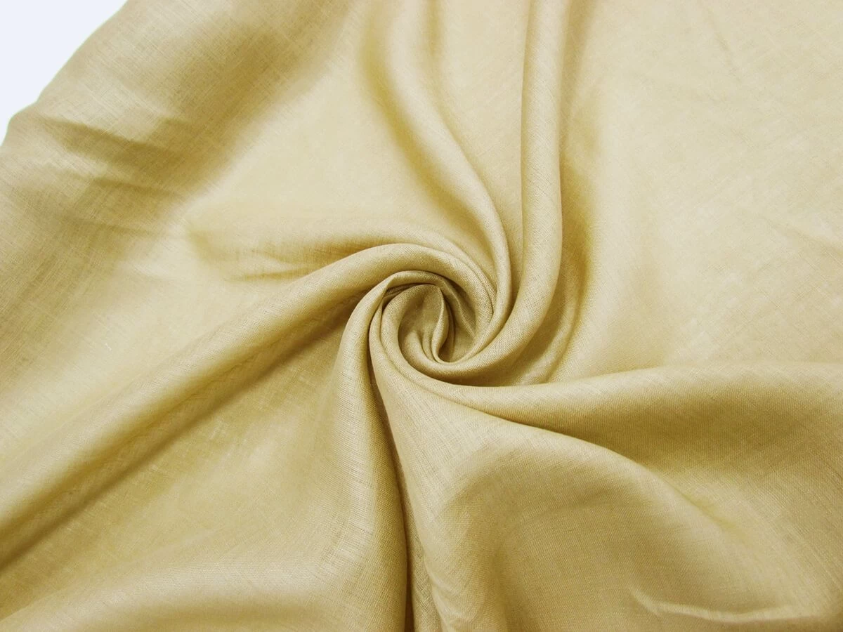 This light sandy brown linen is a very light weight fabric with a soft feel to it. This 100% linen fabric is a mostly sheer fabric due to its more open, loose weave that makes it a comfortable and breathable fabric. Due to this, a lining may be desired for more opacity and to stop light showing through.