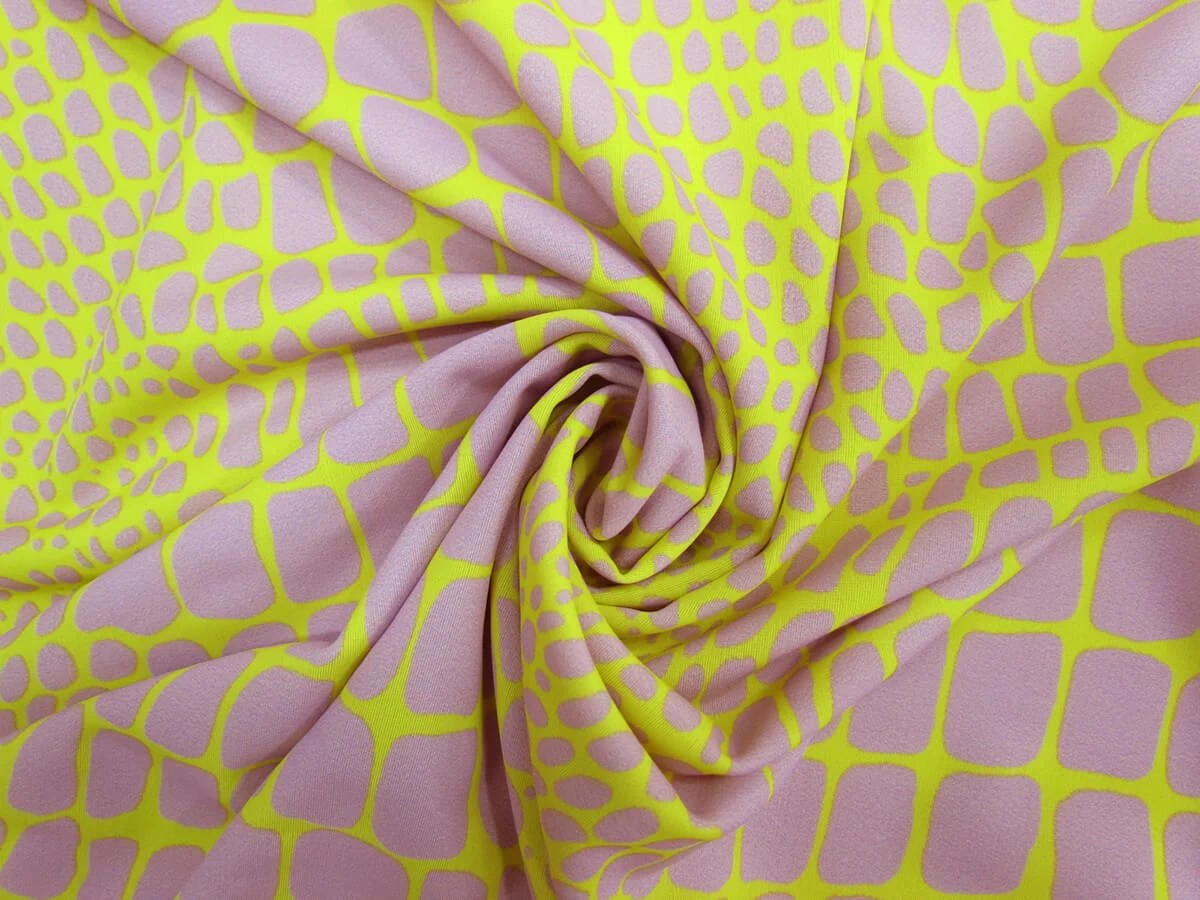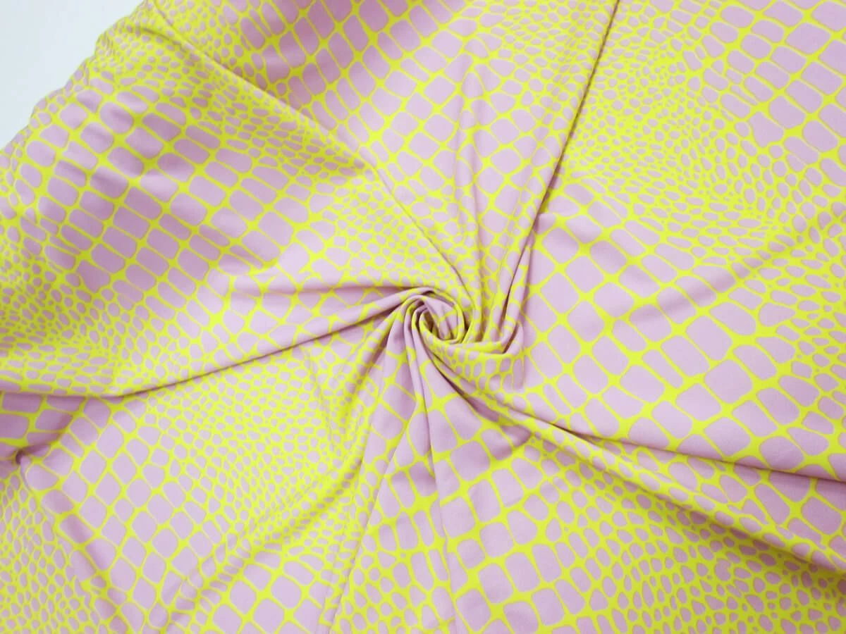 This printed spandex fabric is a medium weigth fabric with a soft feel and a unique print in lilac and a yellow green colour. This spandex has an excellent degree of two way stretch and return. While this fabric is completely opaque, it does sheer when stretched and a lining may be desired for some projects.