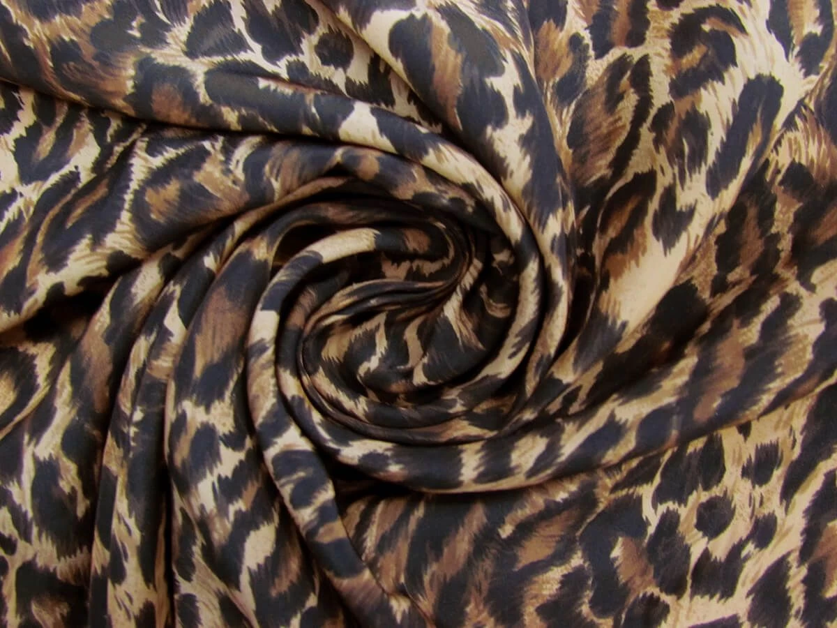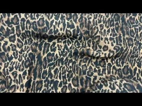 This leopard print peachskin faille fabric is a light weight polyester fabric with amazing drape. This faille is a soft and comfortable fabric that is perfect for various apparel applications. This faille is an opaque fabric, although a lining may still be desired for some projects for extra opacity.