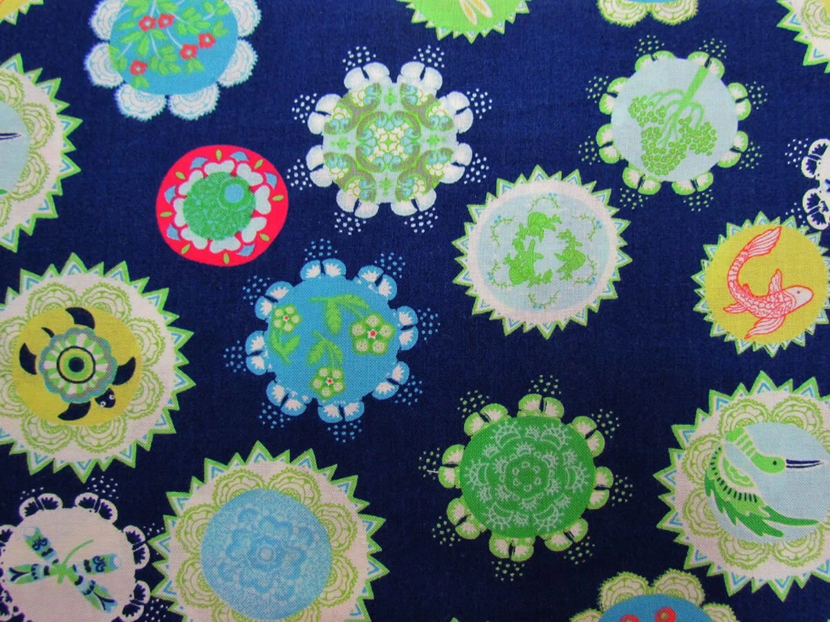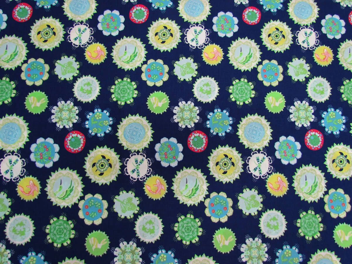 This 100% cotton fabric features a mandala print, with animals including koi fish, dragonflies, rabbits, turtles, and birds, along side florals on a navy background. This print is part of the Moda Fabric range Manderley, designed by Franny & Jane, and is inspired by secret gardens, mandalas, and an oriental decorative style. This cotton fabric is suitable for patchwork and quilting projects as well as shirts, tops, dresses and skirts.