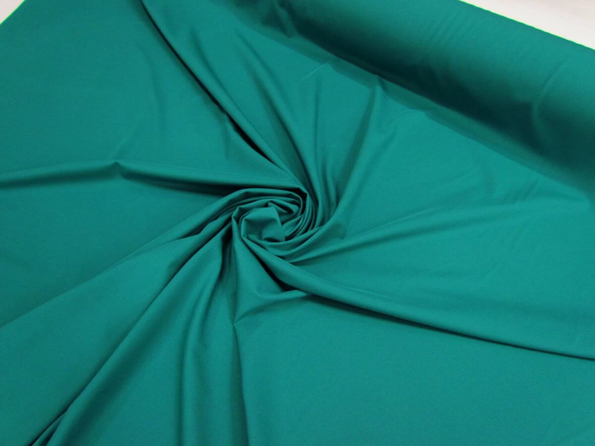 This plain spandex fabric has a matte finish, and a nylon spandex feel. This darker turquoise toned spandex is suitable for swimwear, active wear, leotards, and dance costumes, though it is recommended to use a lining. This spandex has good stretch and return in all directions. If using for swimwear a stretch lining fabric is recommended. This spandex is mostly opaque, though when stretched this spandex does sheer a little.