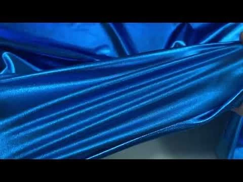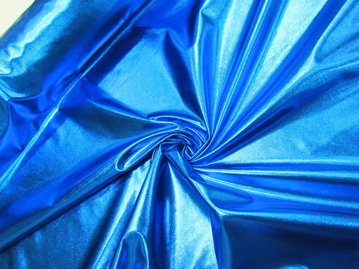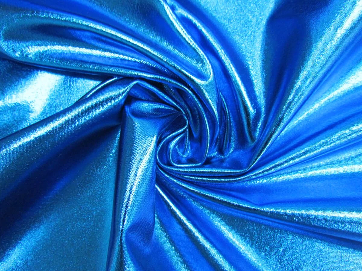 This metallic foile spandex in a vibrant blue has a gorgeous shiny foile finish on one side, with a matte reverse. This foile spandex has excellent stretch and return along the weft of the fabric with good stretch along the warp too. This lycra is comepletley opaque and doesnt sheer or crack when stretched to its full capacity.