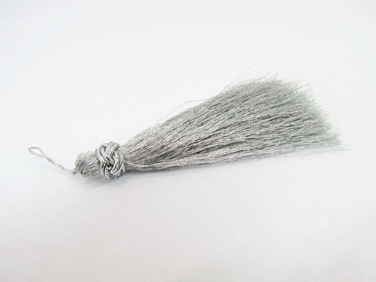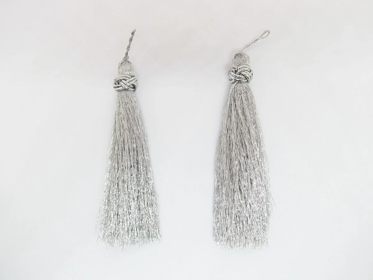 These shiny silver tassels come in a pack of two and are 90mm long with a loop at the top to be hung from craft, apparel and accessory projects.