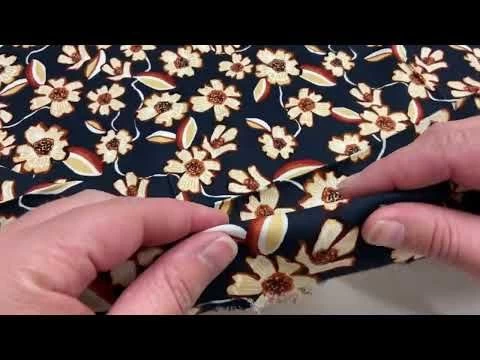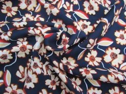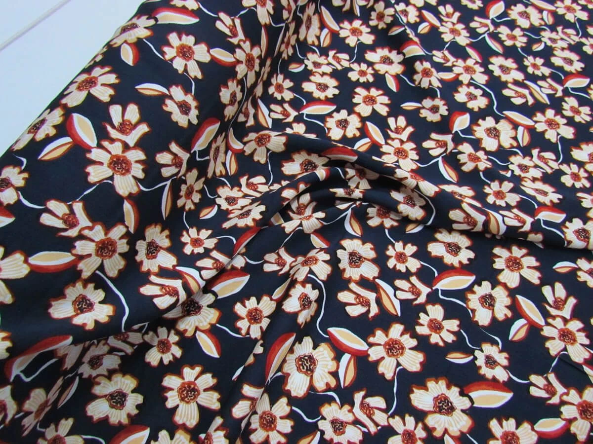 This beautiful crepe fabric has a quite fine texture and falls and drapes wonderfully. Medium weight, opaque with a small to moderate degree of stretch along the weft of the fabric. This crepe viscose stretch fabric features a lovely floral design in earthy terracotta colours on a midnight navy background.