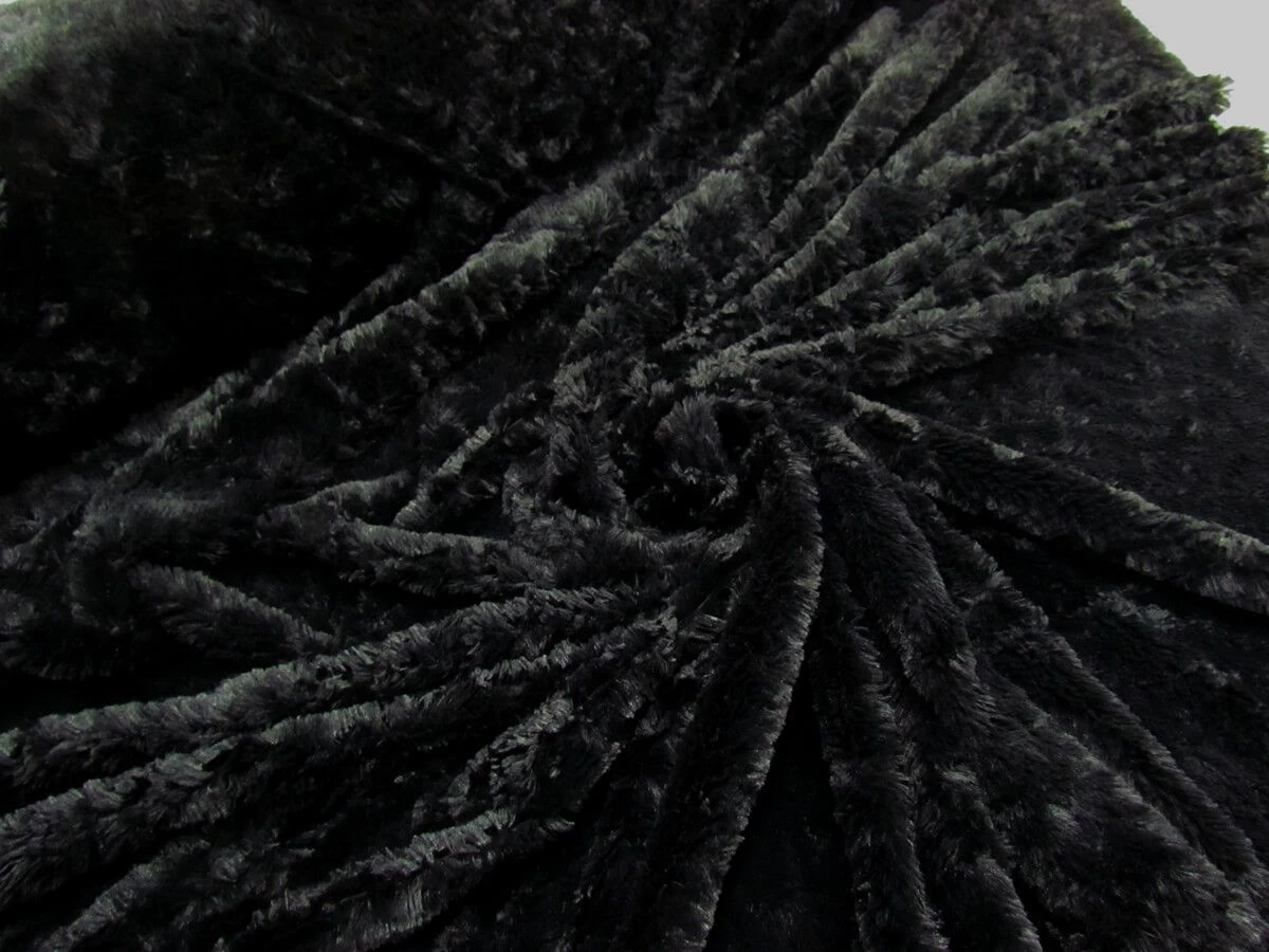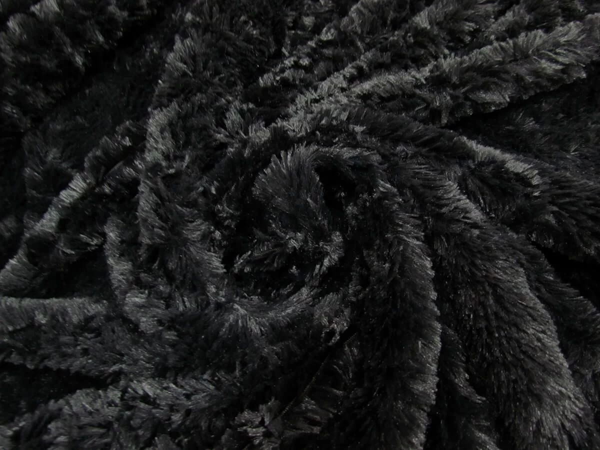 This fur fabric has a very soft and fluffy feel, with a pile about 15 mm long. The backing on this shiny black minky fabric has a knitted look and feel. This fur is suitable for garments as well as costumes, pillows and soft furnishing, and toys. A lining may be desired for comfort if using for garments. This fur does stretch, in one direction, along the weft of the fabric.