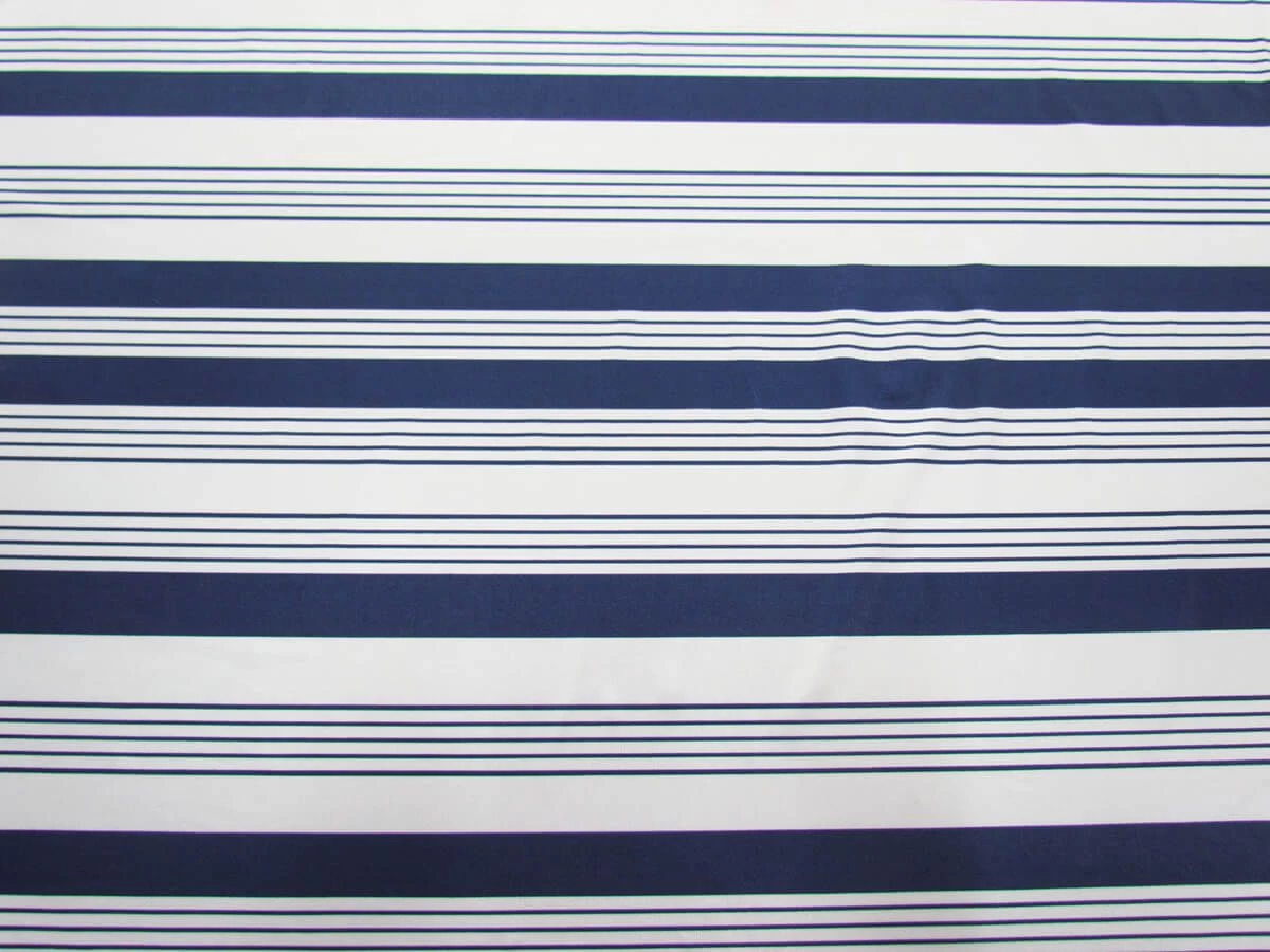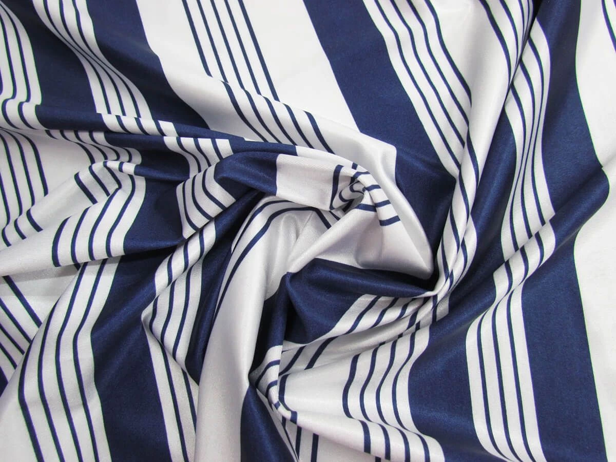 Sometimes you can’t go wrong with a white and navy stripe! This shiny spandex fabric is very slinky and soft, and has great stretch and movement. This spandex has good stretch and return in all directions. This spandex has a shiny lustrous, almost satin finish sheen that catches the light in a wonderful way. This shiny spandex is good for dancewear, costumes, and active wear. As this is such a stretchy spandex, the fabric does become less opaque when stretched, so a lining fabric may be required for some uses.