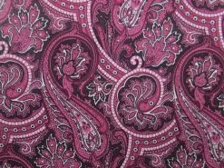 This is a lightweight 100% cotton fabric suitable for patchwork projects that features a magenta and purpple paisley print. This cotton is also suitable for other clothing and craft projects, although may need a lining in apparel applications.