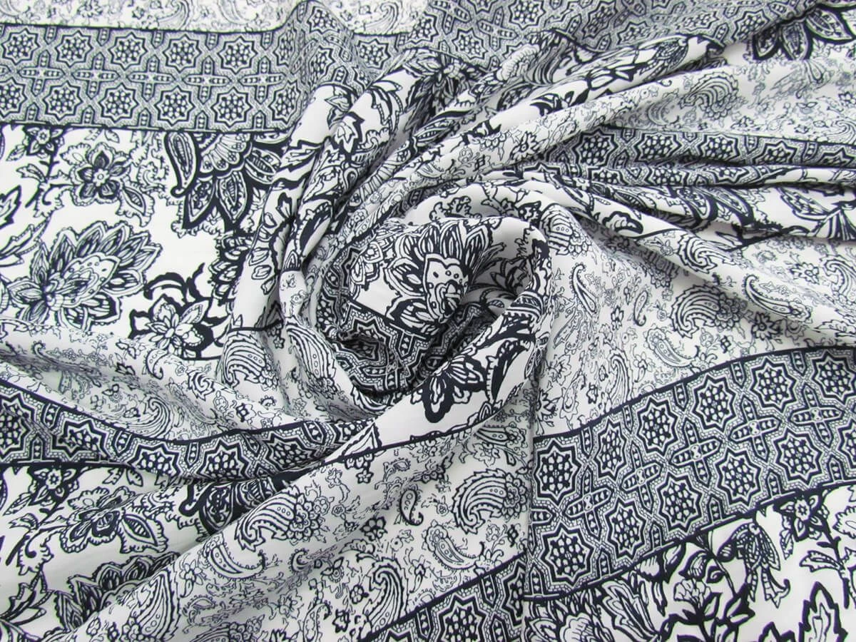 This faille fabric has beautiful drape and fall. This is an semi-opaque printed fabric, but as the fabric is light a lining may be desired for some uses. This faille will make up into shirts, dresses, and skirts, items with fall. This fabric will also drape nicely as decoration for events and theatrical uses.