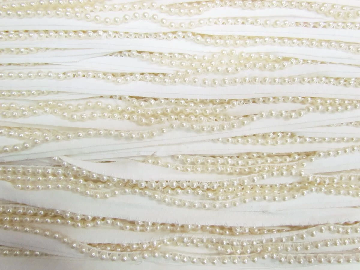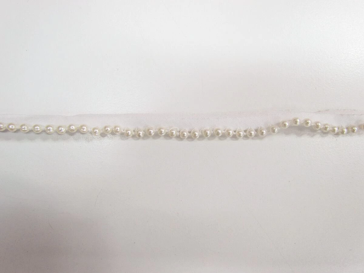 This trim has a string of pearl beads, sewn onto a tape. The full width of this trim is approximately 1.5cm wide. The pearls are 5mm, and the tape is 10mm. The tape is cut on the bias, and the trim is light and flexible, and is suitable for decorative and dressmaking uses, in garments, crafts, and accessories.