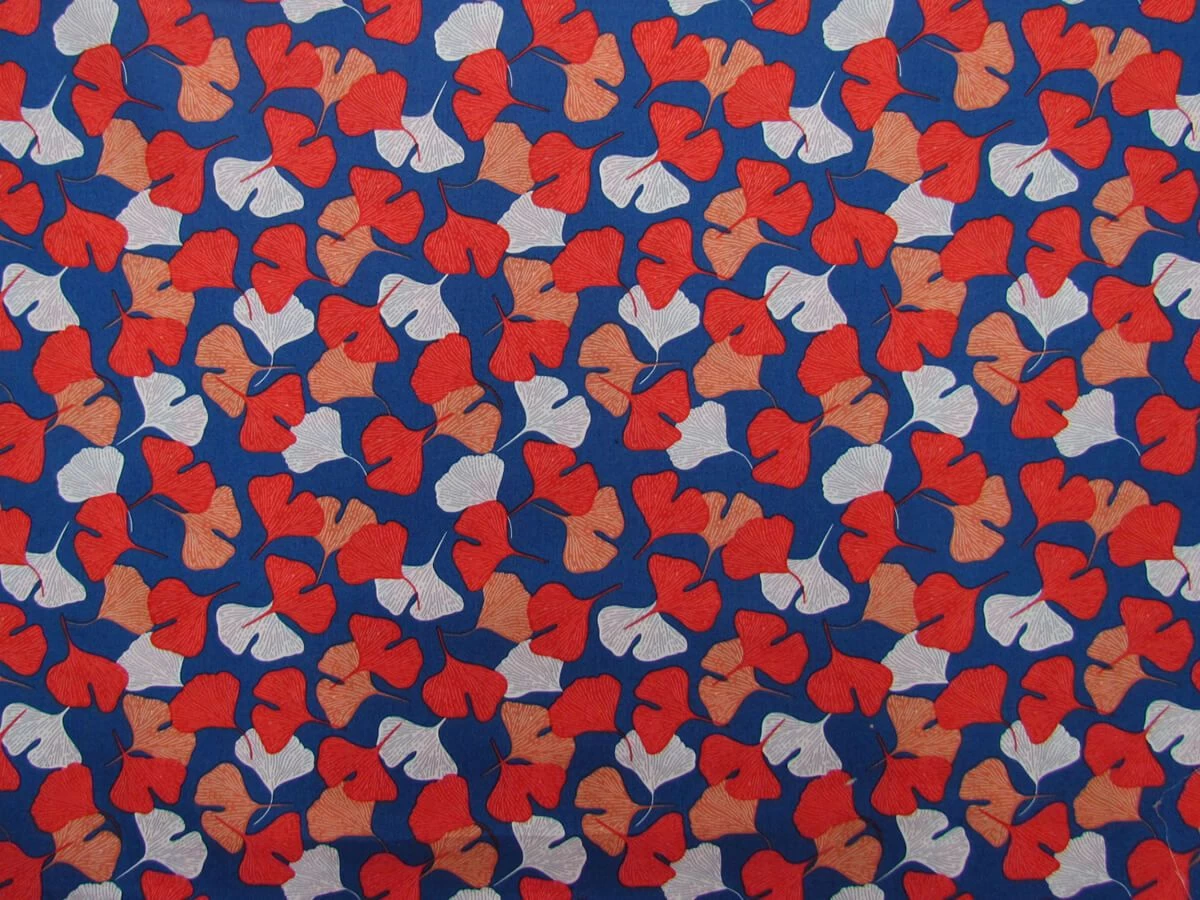 This is a lightweight 100% cotton fabric suitable for patchwork projects that features a petal print in different shades of oranges and white on a blue background. This cotton is also suitable for other clothing and craft projects, although may need a lining in apparel applications.