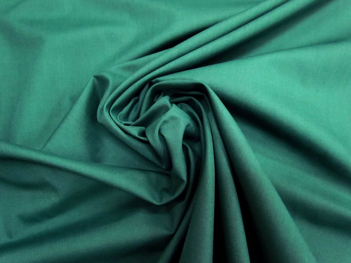 This deep green coloured poplin is a reasonably lightweight woven fabric, with a little drape, and is non stretch. This polyester and cotton blend fabric is mostly opaque, though some darker colours may show through. This poplin fabric does not crease easily, is good to use as is, and is pre-shrunk.