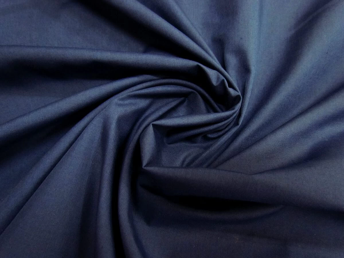 This navy coloured poplin is a reasonably lightweight woven fabric, with a little drape, and is non stretch. This polyester and cotton blend fabric is mostly opaque, though some darker colours may show through. This poplin fabric does not crease easily, is good to use as is, and is pre-shrunk.