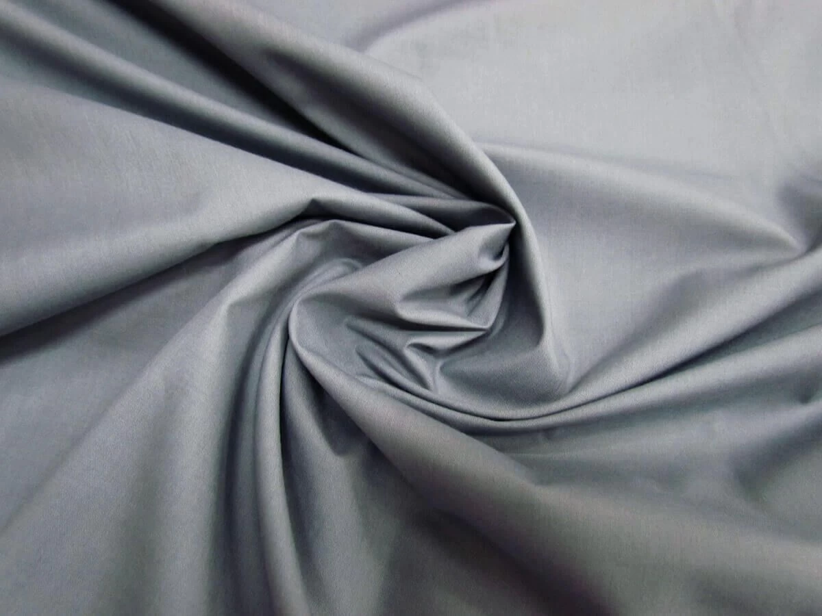 This grey coloured poplin is a reasonably lightweight woven fabric, with a little drape, and is non stretch. This polyester and cotton blend fabric is mostly opaque, though some darker colours may show through. This poplin fabric does not crease easily, is good to use as is, and is pre-shrunk.