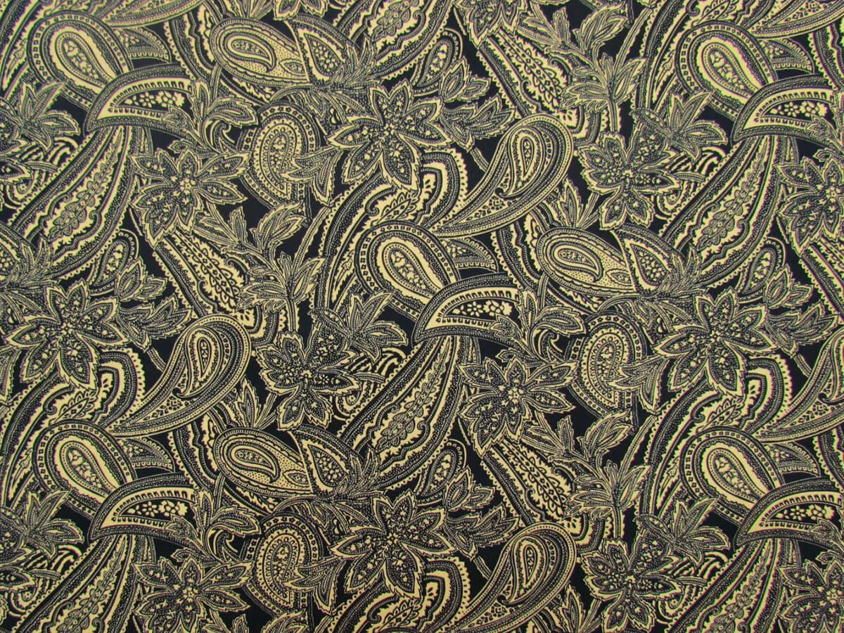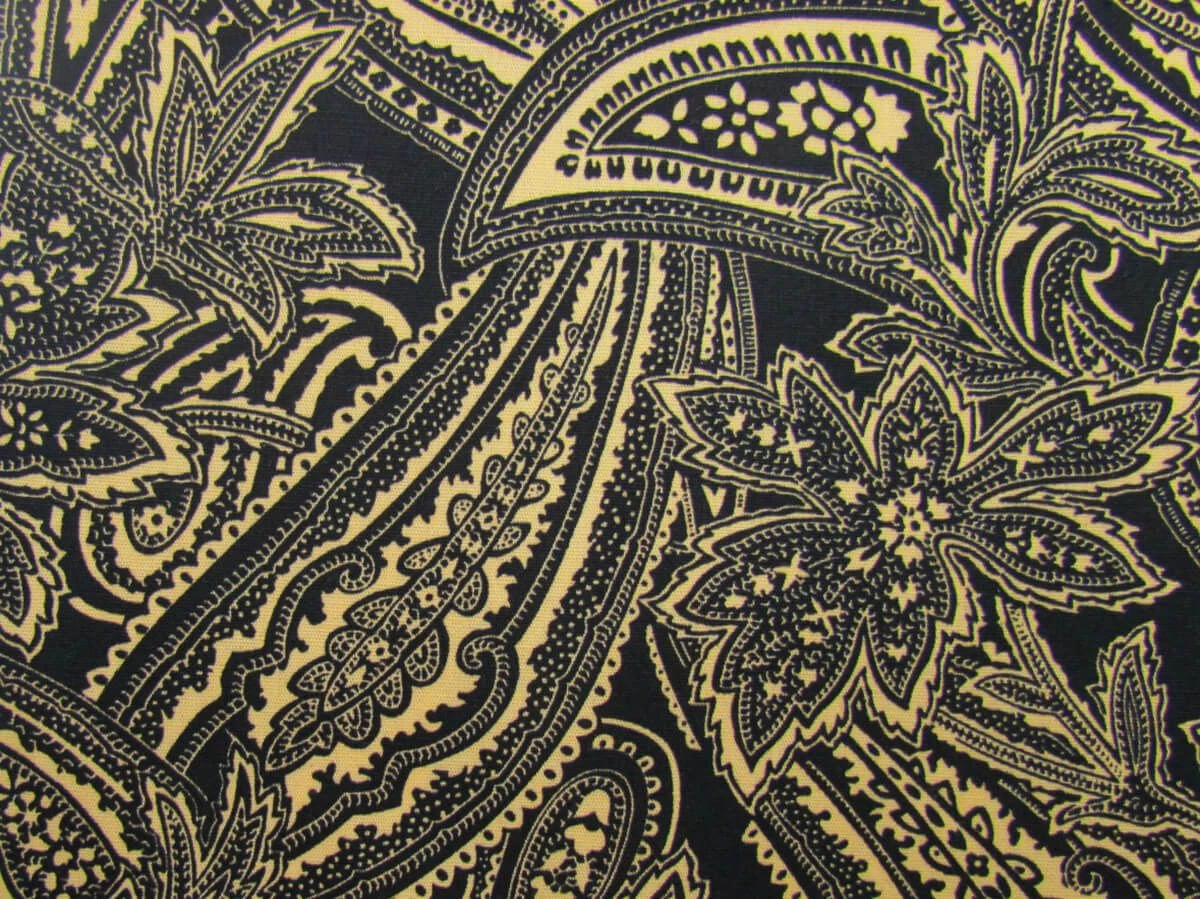 This is a lightweight 100% cotton fabric suitable for patchwork projects that features a yellow paisley print on a black background. This cotton is also suitable for other clothing and craft projects, although may need a lining in apparel applications.