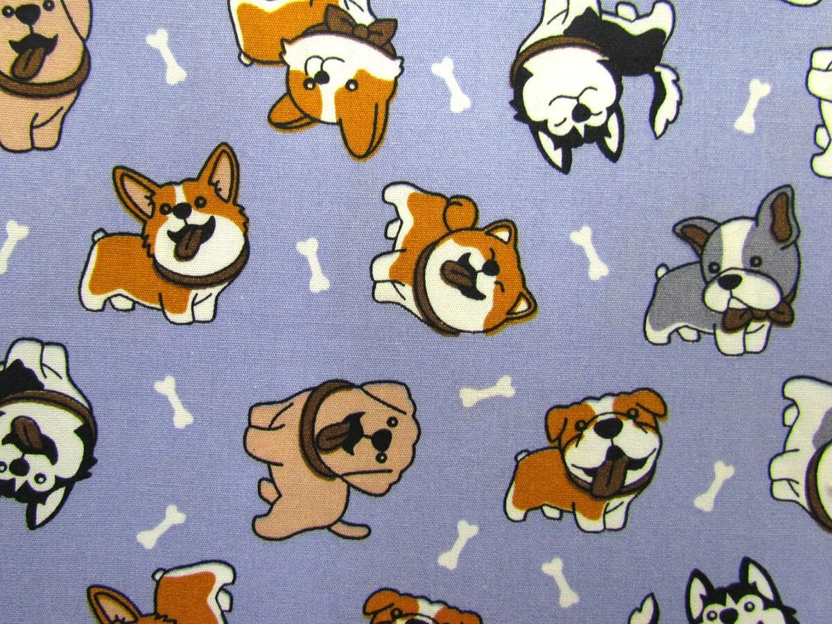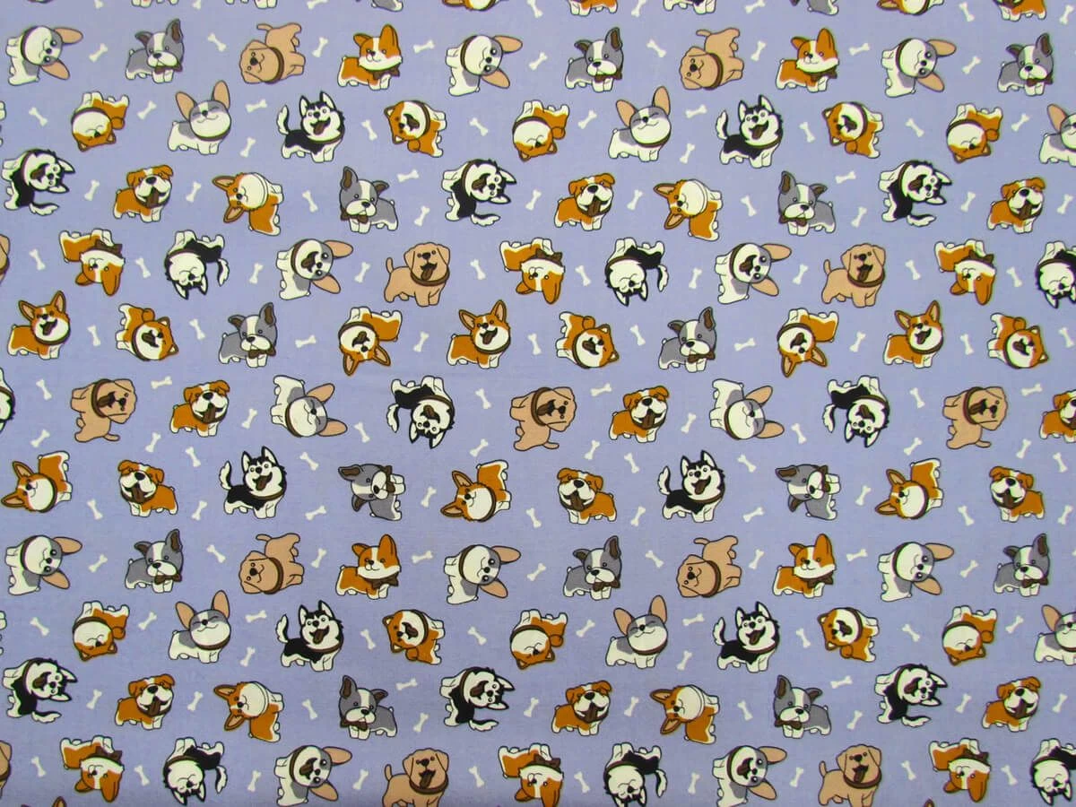 This is a lightweight 100% cotton fabric suitable for patchwork projects that features an adorable dog print on a periwinkle blue background. This cotton is also suitable for other clothing and craft projects, although may need a lining in apparel applications.