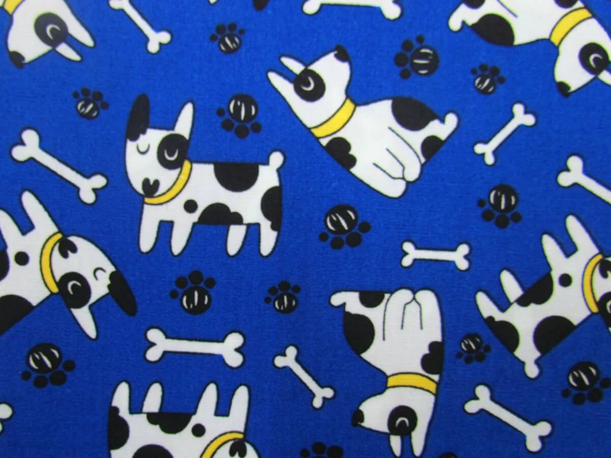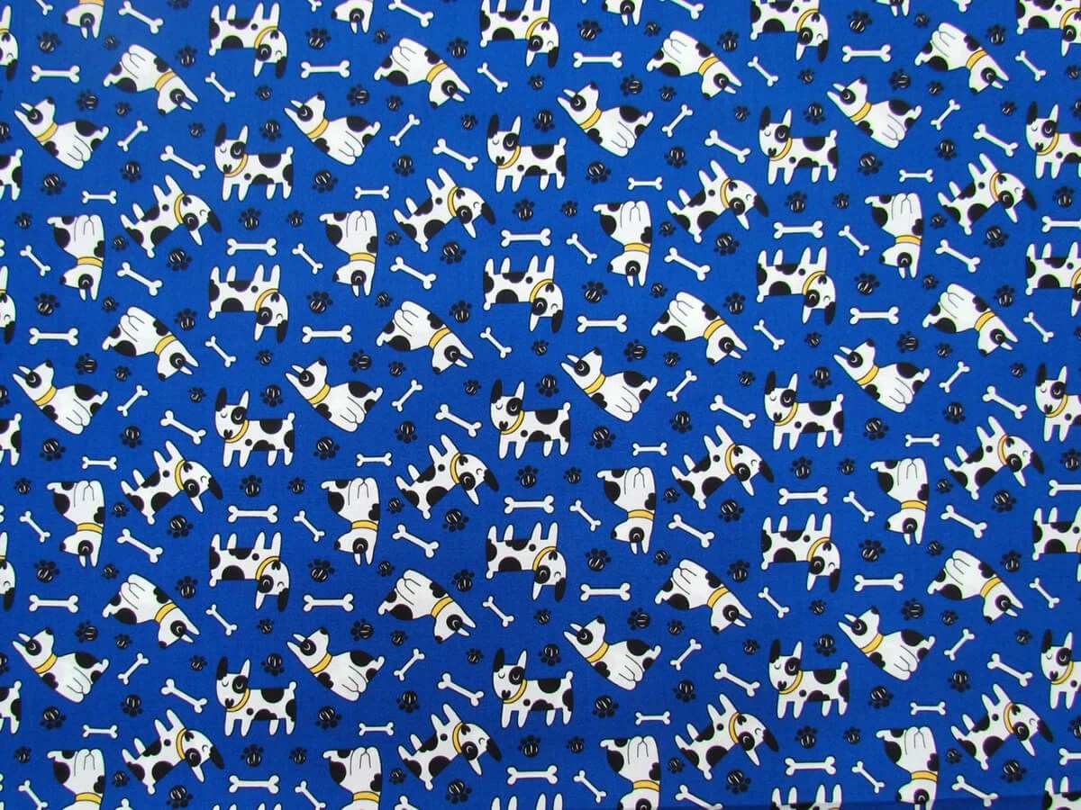 This is a lightweight 100% cotton fabric suitable for patchwork projects that features an adorable dpg print on a blue background. This cotton is also suitable for other clothing and craft projects, although may need a lining in apparel applications.