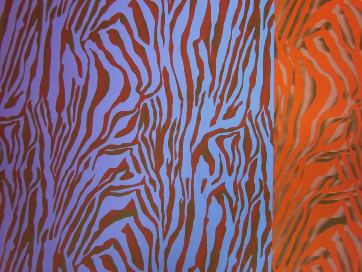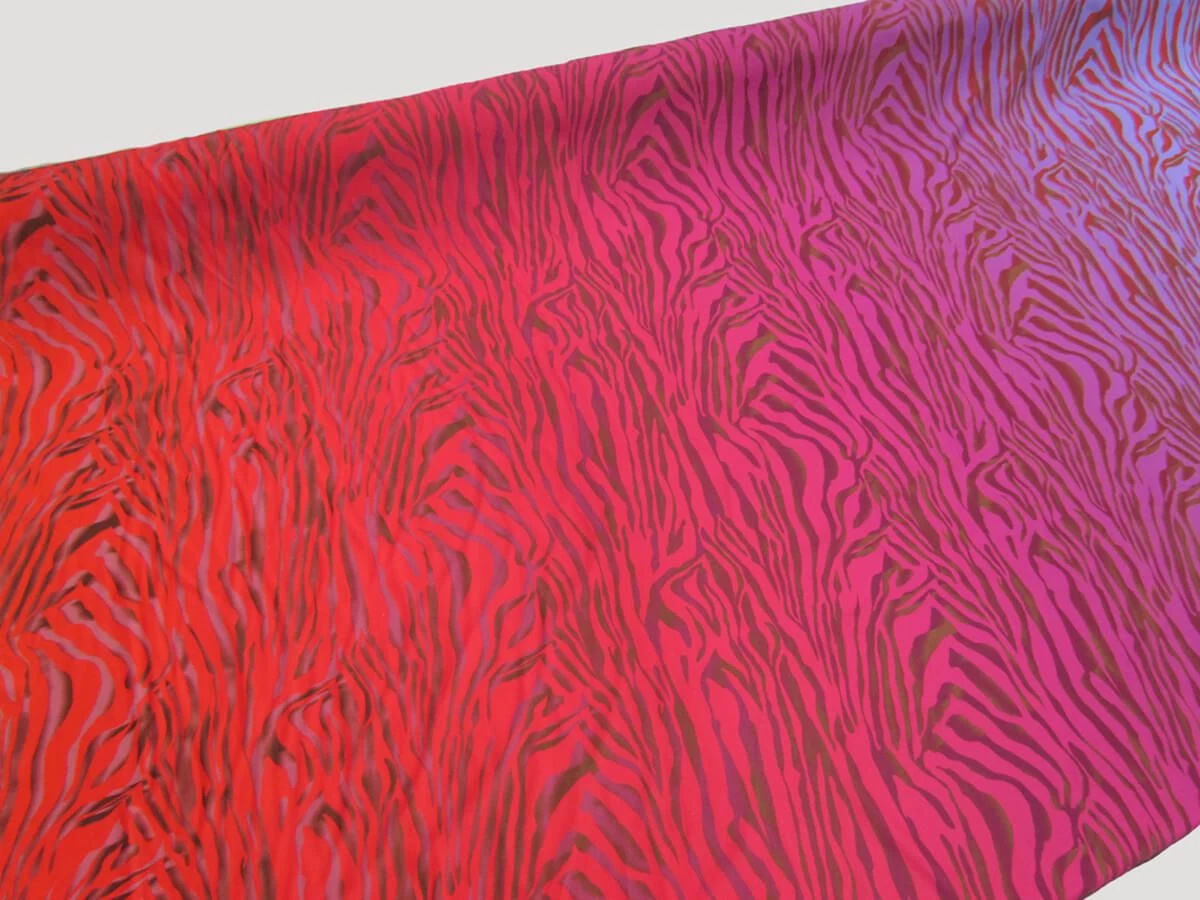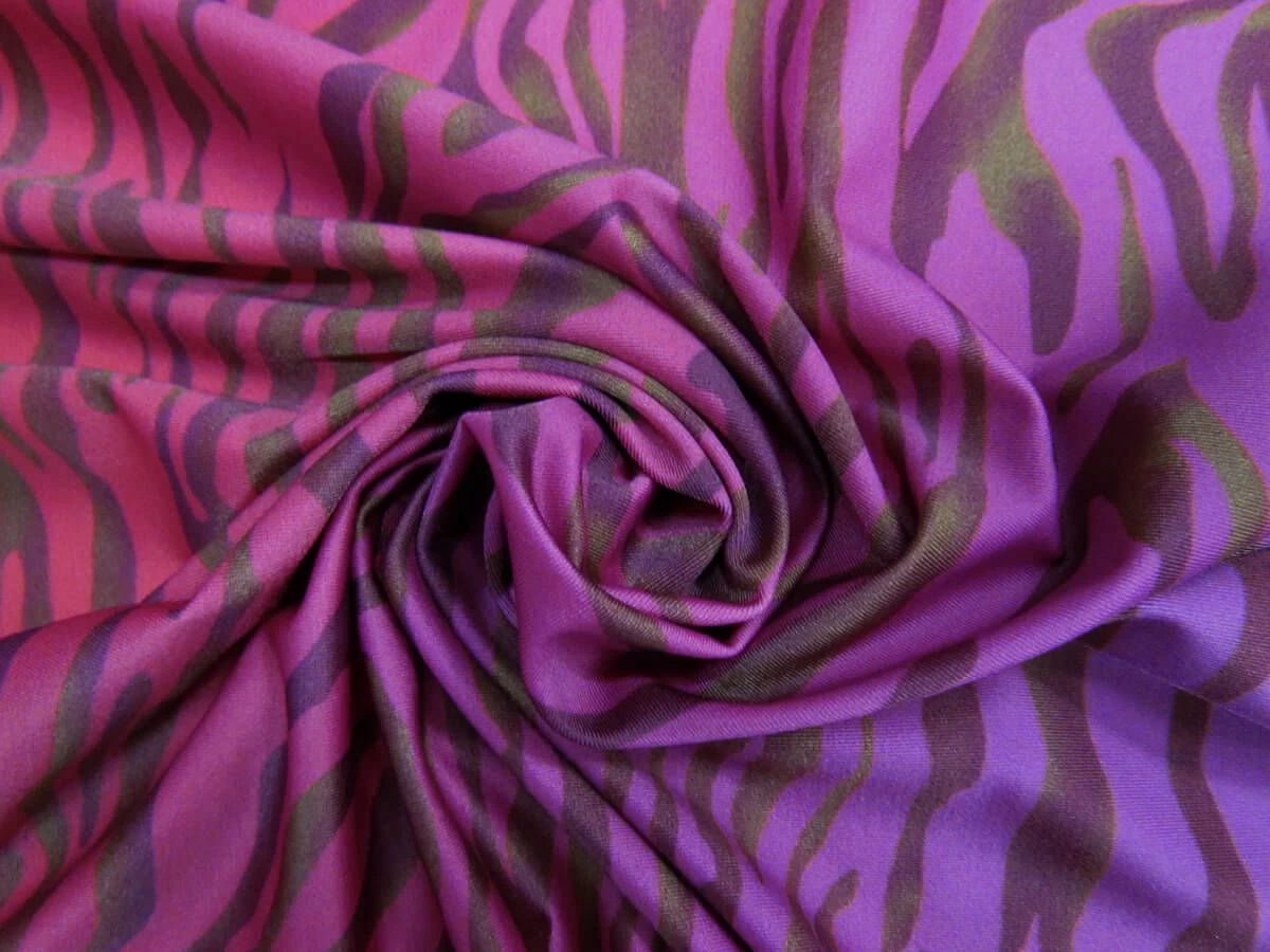 This rainbow ombre matte spandex with a zebra print throughoutis a medium weight fabric that has a very soft and comfortable feel. This spandex has great two way stretch and return. This spandex is a semi-opaque fabric and some darker colours show through the fabric, with the fabric sheering more when stretched to its full capacity. This fabric measures 150cm in width, however one end has a “join” in the print as the print repeated slightly as seen in the third photo above. The width of the printed part of the fabric excluding this join is approximately 137cm.