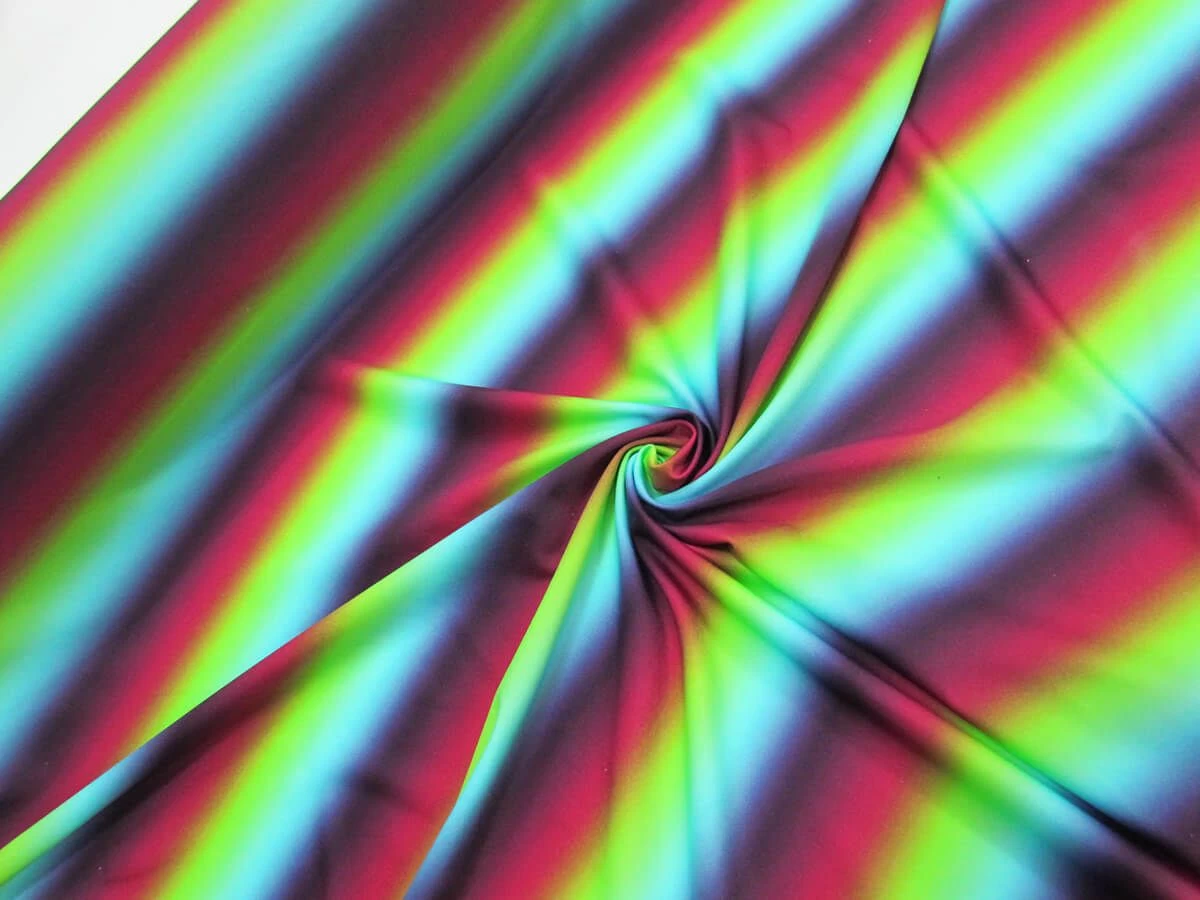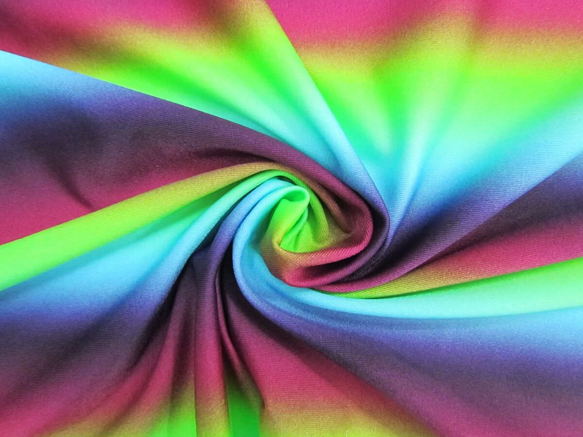 This rainbow ombre matte spandex is a medium weight fabric that has a very soft and comfortable feel. This spandex has great two way stretch and return. This spandex is a semi-opaque fabric and some darker colours show through the fabric, with the fabric sheering more when stretched to its full capacity.