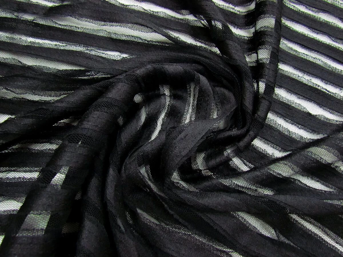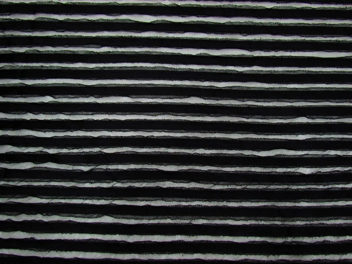 This tulle fabric is a very light mesh featuring a light ribbon detail, with a net ruffle, stitched onto the face of this tulle and striped horizontally across the fabric. With no give or stretch, this net is still soft to the touch and has a little drape and fall.