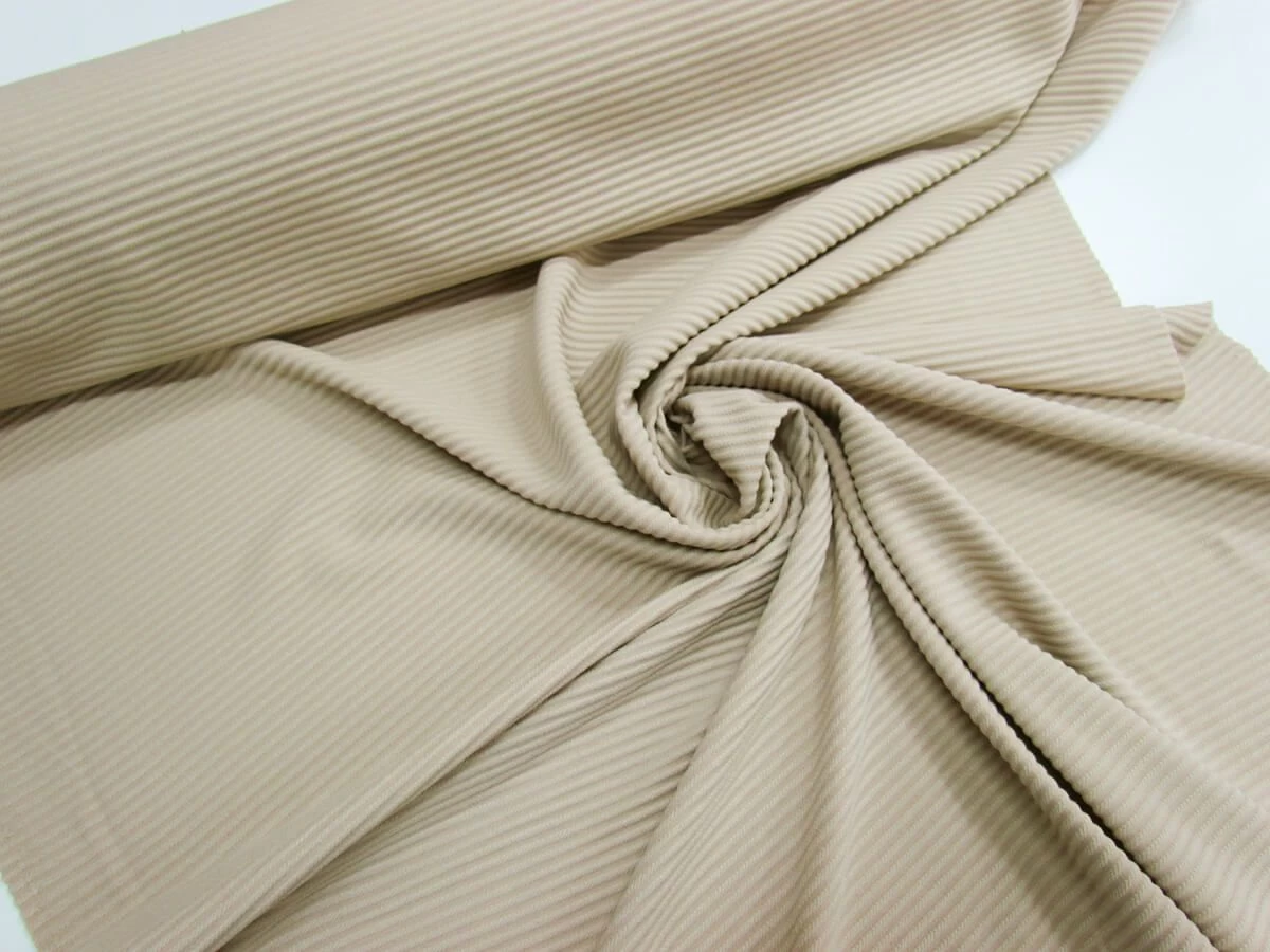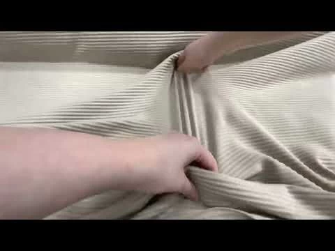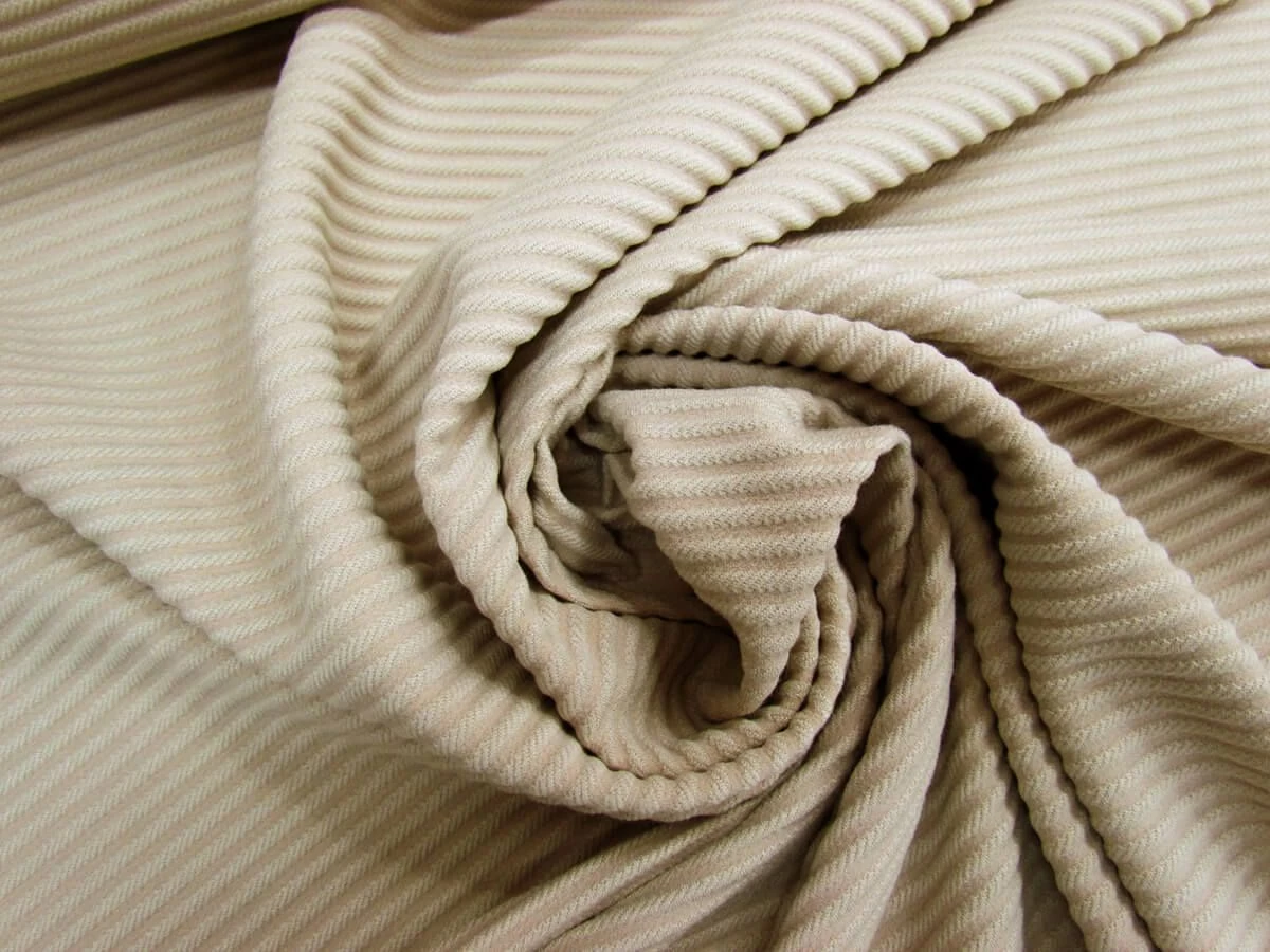 This knit fabric has a thick feel, and a textured ridged look. The ridges on this fabric, run vertically down the length, for a self striped / ribbed sort of look. This is a heavier weight knit fabric, which has a soft comfortable textured feel. This knit fabric has good stretch and return in all directions. This knit has a lovely opaque look, though may show through a little when stretched.