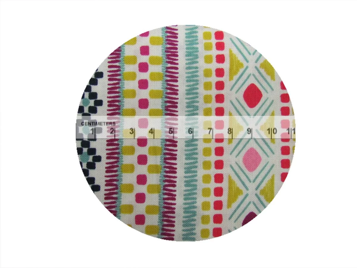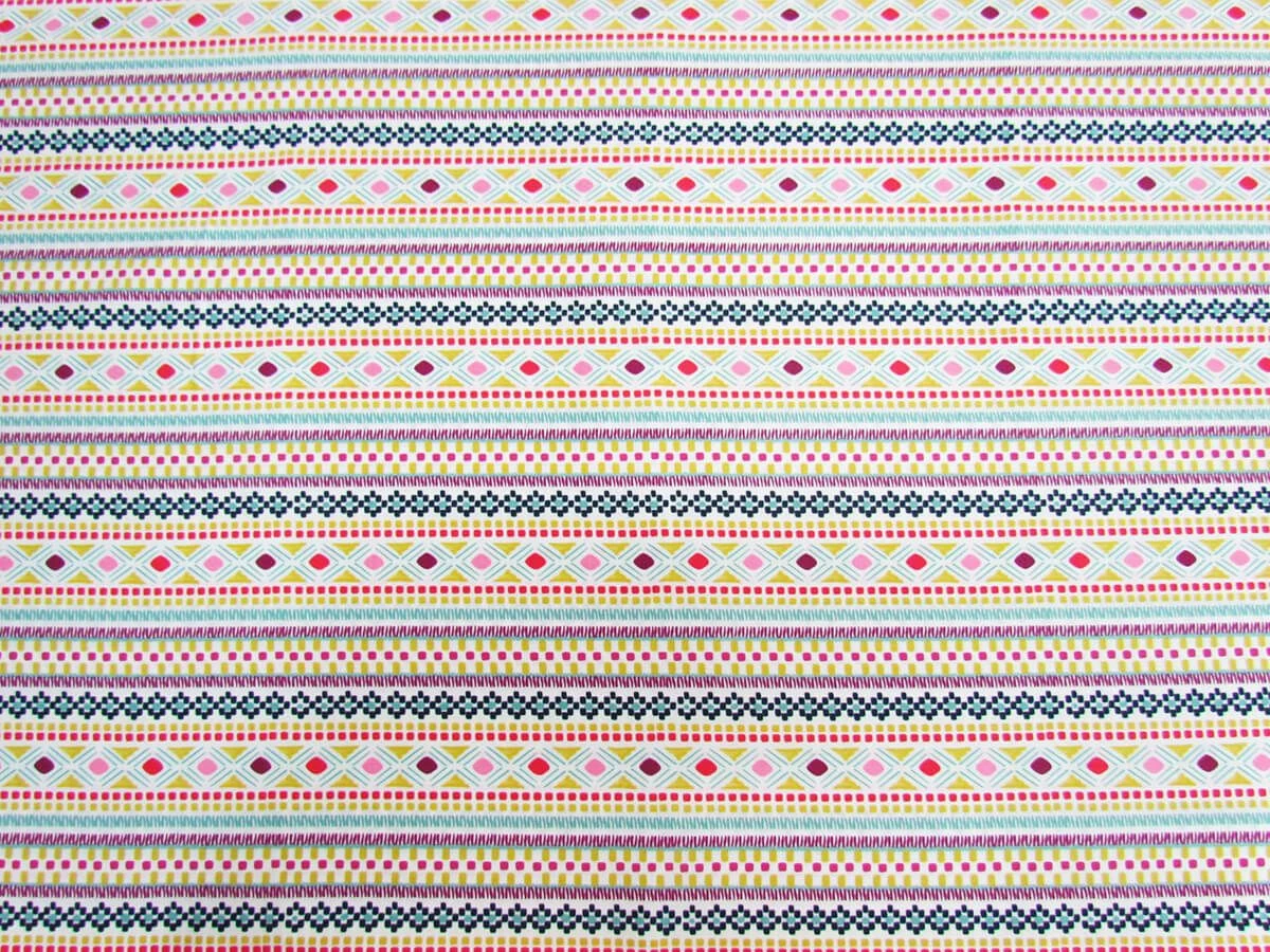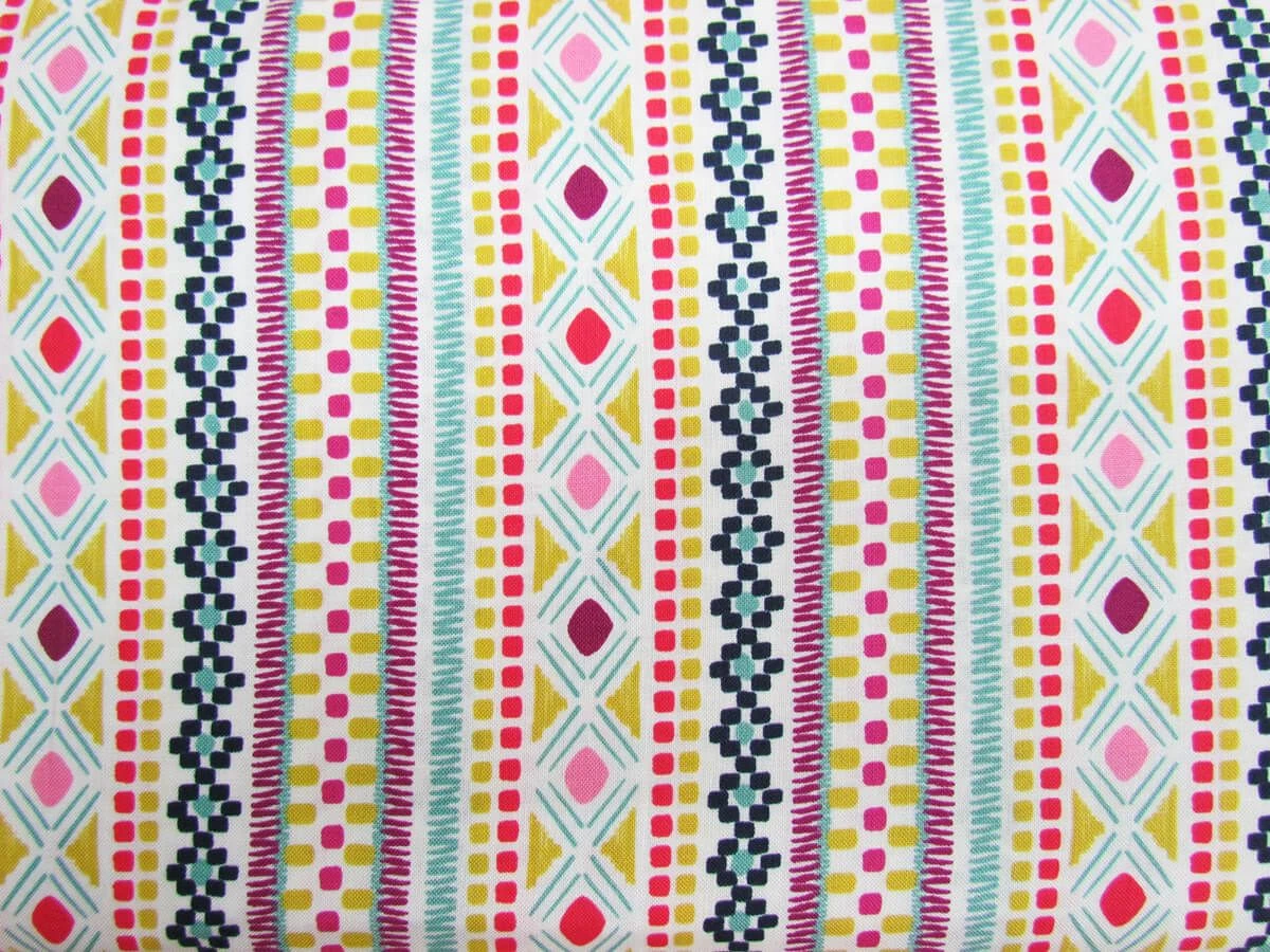 This 100% cotton fabric features a Southwestern stripe print of bright shapes, on a creamy white background. This print is part of the Moda Fabric range Rosa, designed by Crystal Manning, and inspired by Central American tribal patterns and symbols of love, such as luch roses and swallows. This cotton fabric is suitable for patchwork and quilting projects as well as shirts, tops, dresses and skirts.