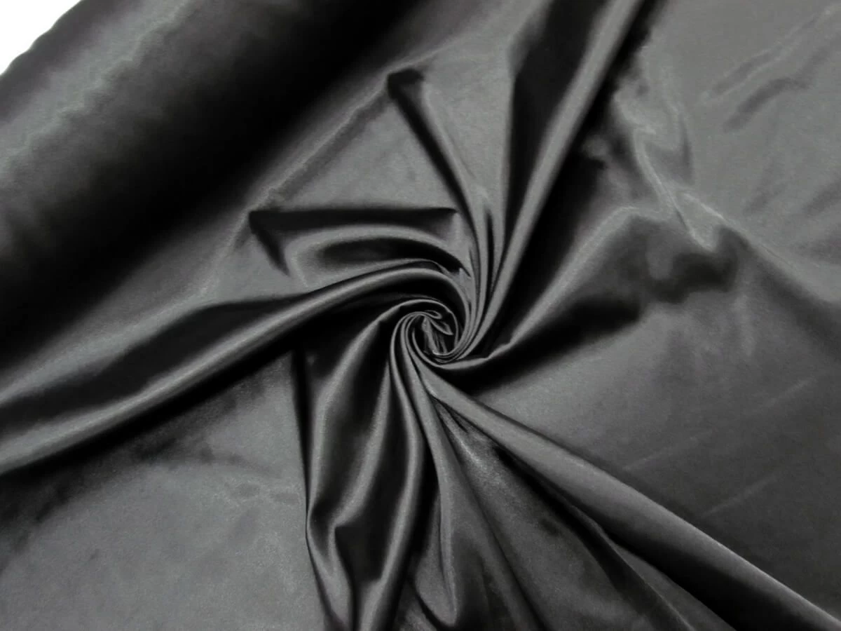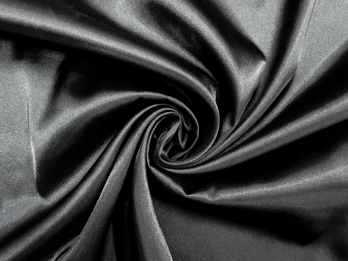 This polyester satin fabric in black is a light weight fabric with amazing drape and a lovely sheen. This satin is completely opaque with one smooth and shiny side, and one more matte side. This satin has a slight degree of stretch along the weft of the fabric.