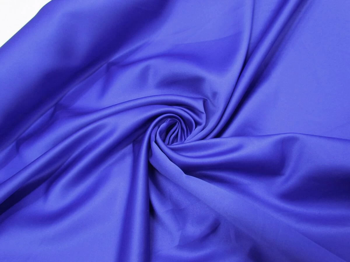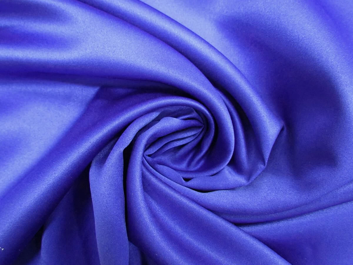 This polyester satin fabric in a vibrant blue is a light weight fabric with amazing drape and a lovely sheen. This satin is completely opaque with one smooth and shiny side, and one more matte side. This satin has no stretch.