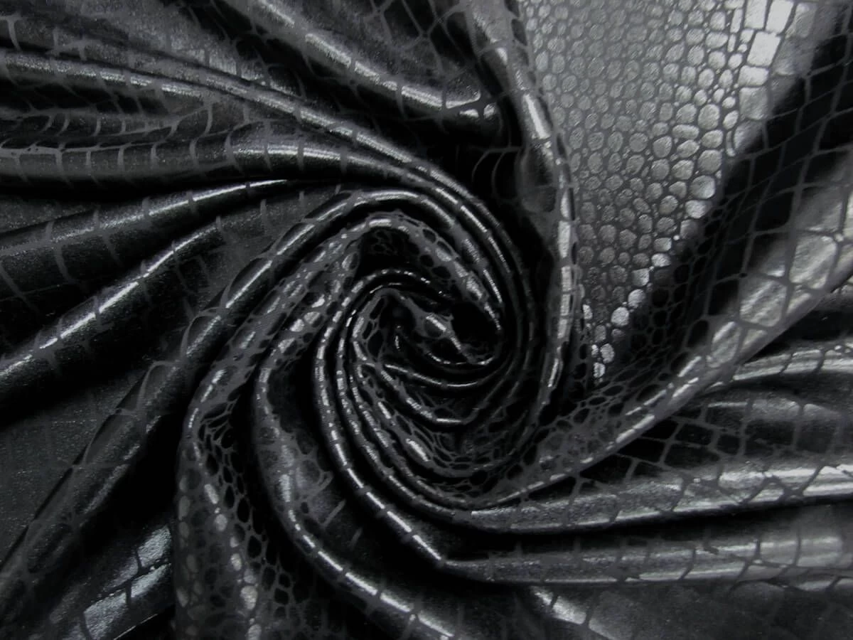 This snake skin print foil on spandex is black in colour, with a slight dark blue tint that can be better seen on the shinier snake skin surface. This spandex is a medium weight fabric that has great two way stretch and return, with the foil resisting cracking even when stretched to its full capacity. This foil spandex is a soft and comfortable feeling fabric that is opaque, even when stretched. Thsi fabric measures 155cm in total width, however does ave a wide selvedge so the width of the fabric with the foil print is approximately 150cm