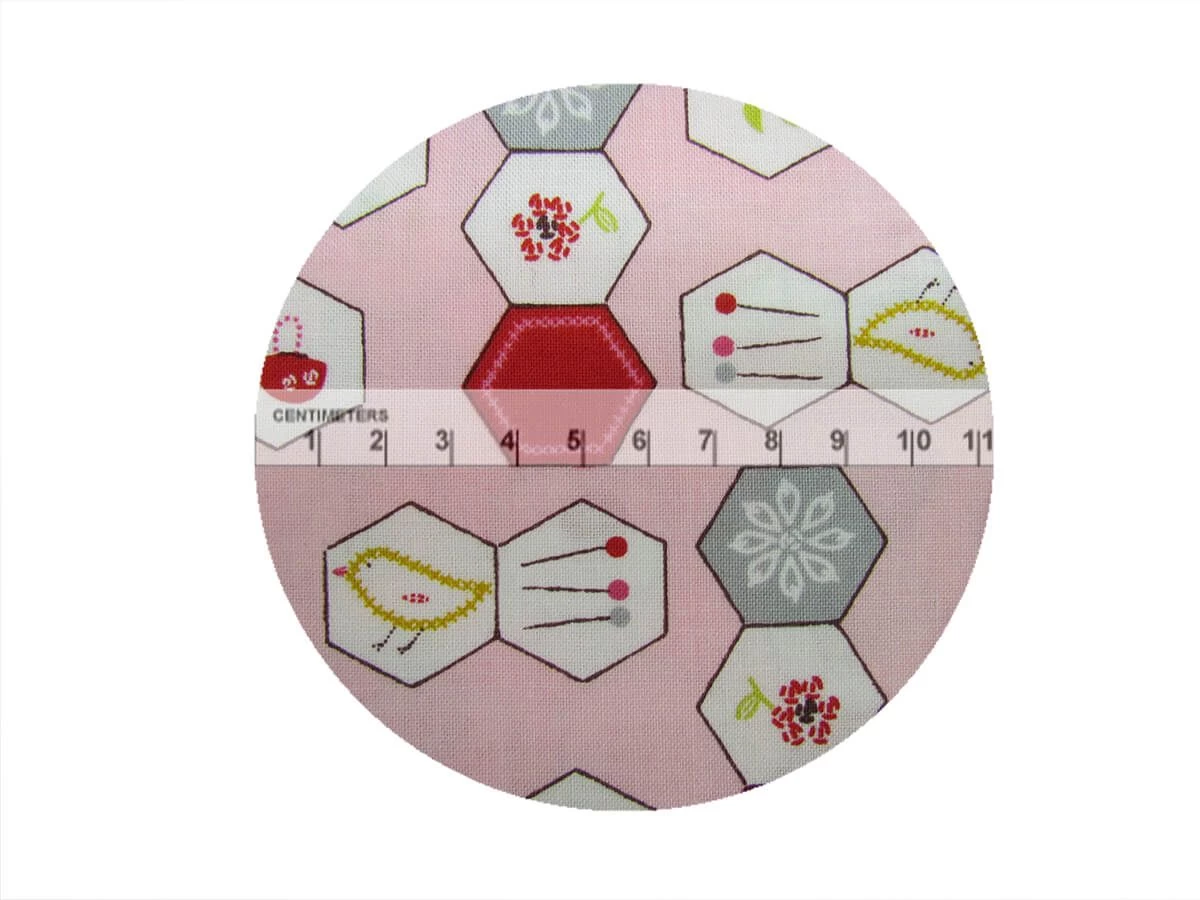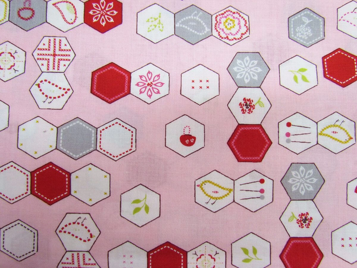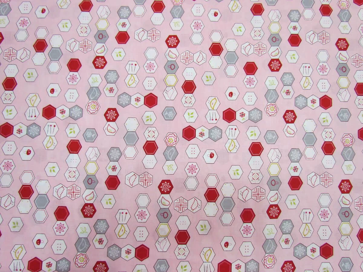 This 100% cotton fabric features a print of hexagons with an embroidery and sewing theme. This print is part of the Moda Fabric range Sew Stitchy, designed by Aneela Hoey. This cotton fabric is a lovely quality and has been designed for use in patchwork quilting projects and garments.