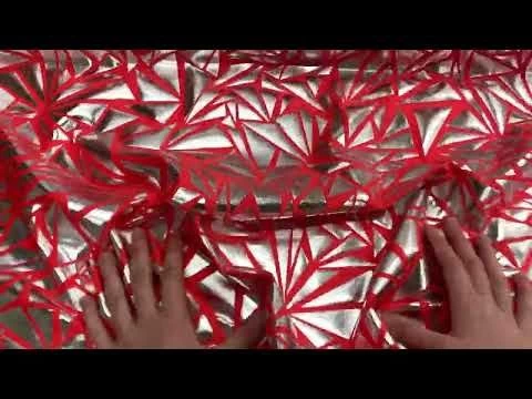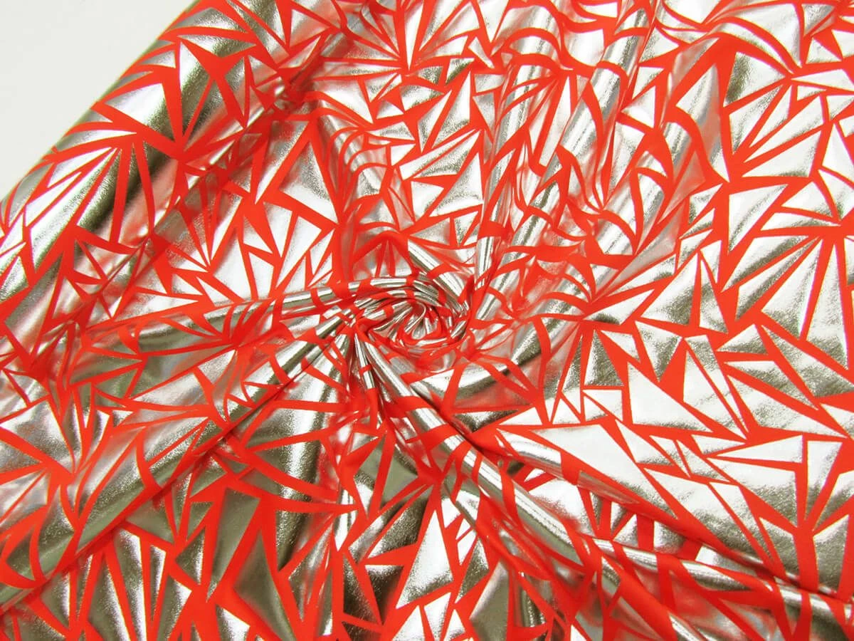 This nylon and spandex blend has a foile finish in a shard look print. This spandex is a medium weight fabric excellent two way stretch and return with the foile finish of this fabric not cracking after being stretched. This is an opaque fabric that does sheer more when stretched so a lining may be desired in applications where stretch and opacity are needed. This fabric measures 151cm in width, however has wider selvedges so the width of the foile area is approximately 145cm.
