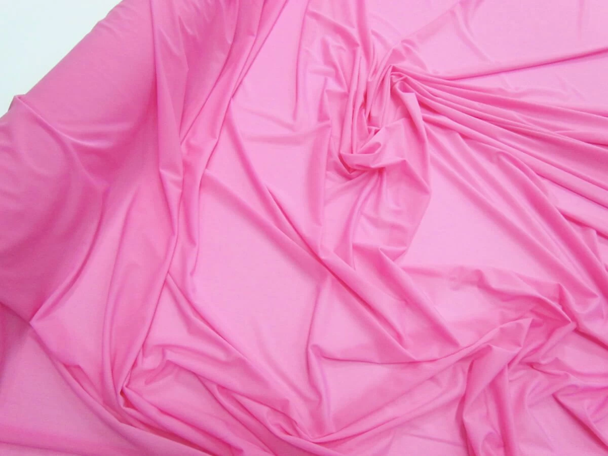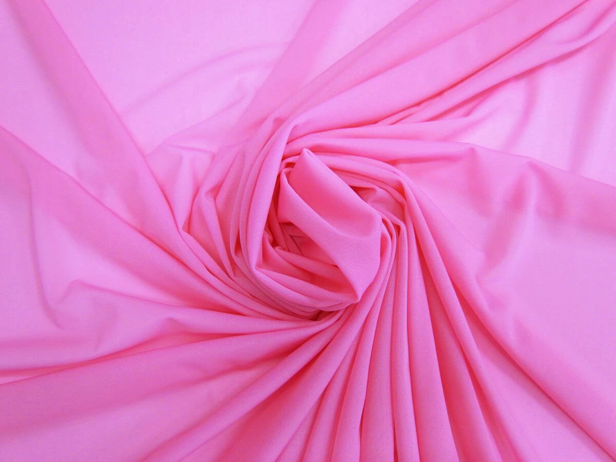 This is a nylon spandex fabric, with a lovely smooth and soft, comfortable feel. This fabric has great lycra stretch and return all directions. Originally manufactured for gym wear, swimwear, active wear, and sports uses, this is a good quality spandex knit fabric, with lightweight look and feel. This is a pink spandex with a very sheer look. Will need to use with another stretch fabric for a more opaque look. Or use alone as a specific sheer spandex look.