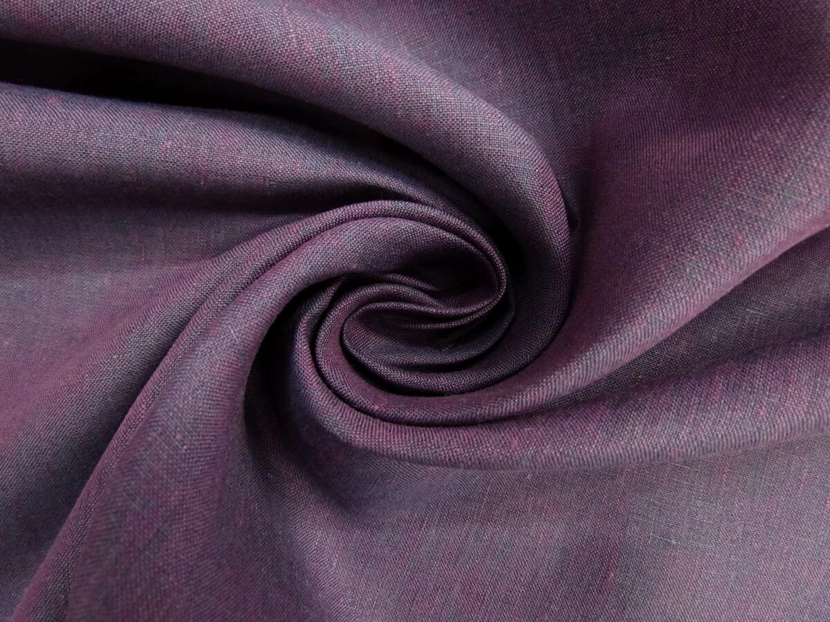 This linen has a shot look, with the weft yarns being a dark blue colour and the warp yarns being a dark purple, giving a mottled purple look to the fabric overall. This beauiful linen is a light weight fabric with a soft feel and a light amount of structure. This linen is completely opaque and is suitable for a variety of apparel and other projects including pants, tops, dress and skirts.