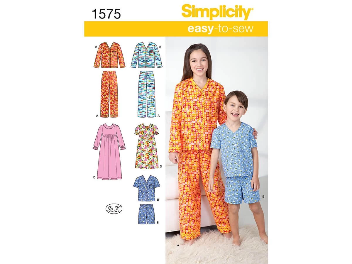 Simplicity Pattern S1575 Child’s, Girl’s and Boy’s Loungewear- Size HH (3-4-5-6) – is a standard printed tissue pattern (not downloadable). Child’s, girls’ and boys’ lounge-gown in two lengths, trousers, shorts and pocketed shirt with sleeve variations. Simplicity sewing pattern.*Note: If used as sleepwear, use Fabrics & Trims that meet the Flammability Standards set by the U.S. Government.* See the second image for back of the pattern packet which lists recommended fabric types, size chart and meterage required.