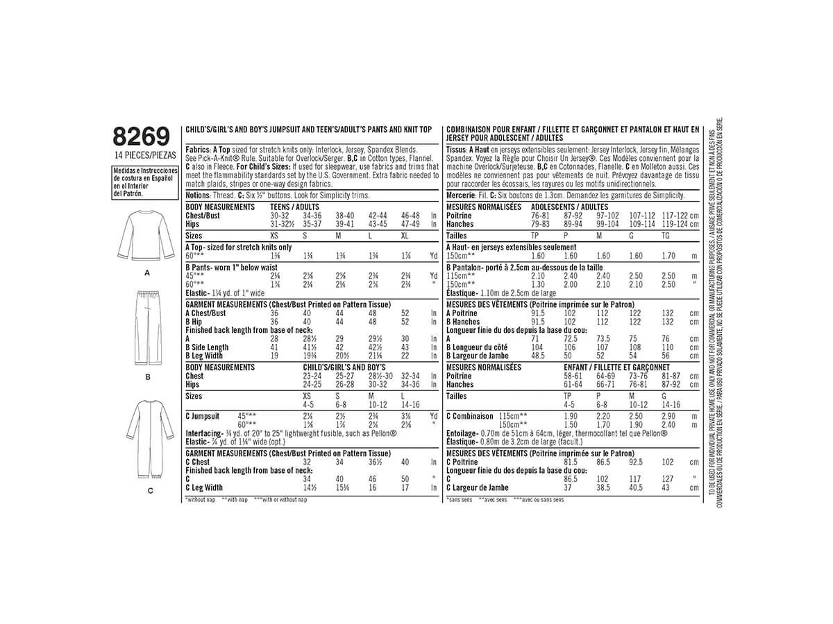 Simplicity Pattern S8269 Child’s Girls’ and Boys’ Jumpsuit and Teens’ and Adults’ Trousersand Knit Top- Size A (XS – L / XS – XL) – is a standard printed tissue pattern (not downloadable). Make this, all sizes in one, pattern in coordinating fabrics for a fun matching family look. Includes button front jumpsuit sized for children, girls, boys, and easy pull on trousers with knit v neck top sized for teens and adults. Simplicity sewing pattern.