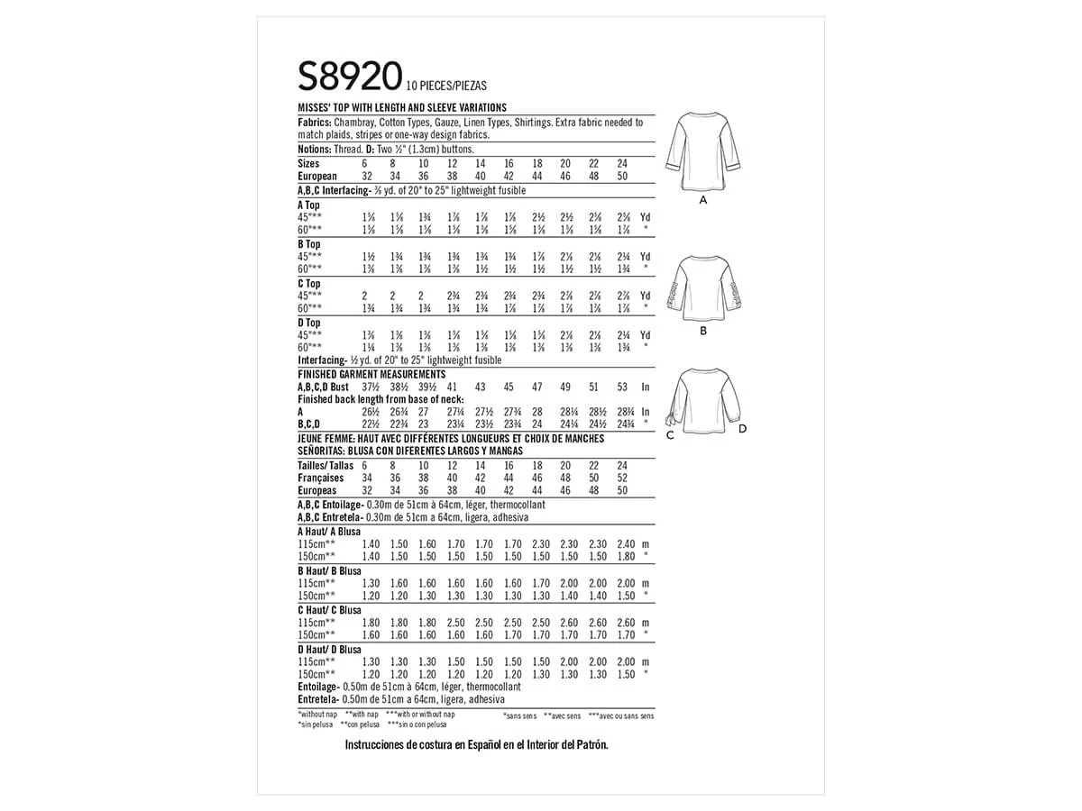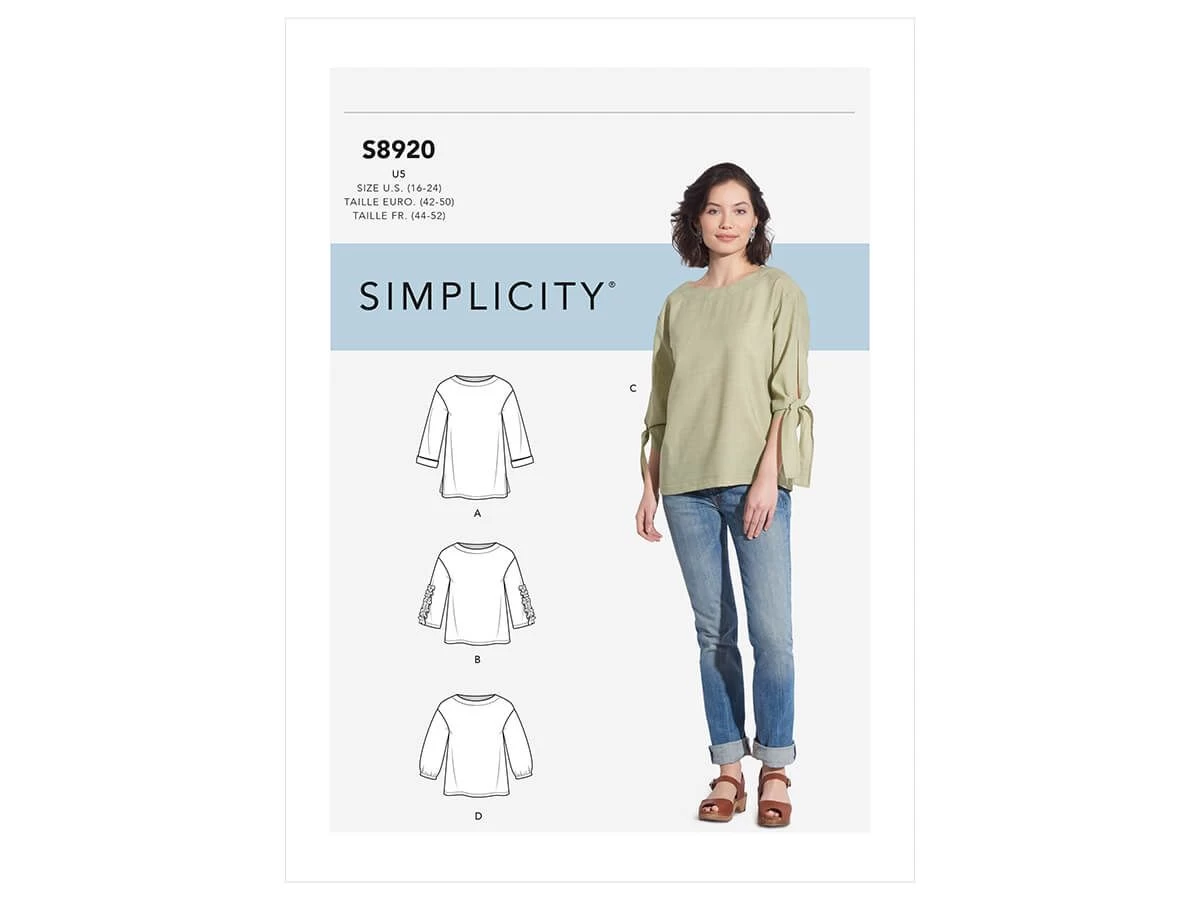 Simplicity Pattern S8920 Misses’ Tops- Size U5 (16-18-20-22-24) – is a standard printed tissue pattern (not downloadable). Simplicity Sewing Pattern SS8920U5 (16-18-20-22-24) women,tops-vests, Misses’ top with length & sleeve variations See the second image for back of the pattern packet which lists recommended fabric types, size chart and meterage required.