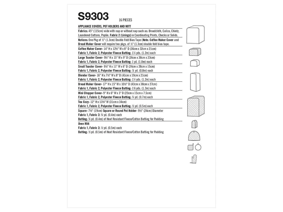 Simplicity Pattern S9303 APPLIANCE COVERS- Size OS (ONE SIZE) – is a standard printed tissue pattern (not downloadable). Add some charm with custom appliance covers, pot holders & oven mitt, all with easy bias-tape finishing & optional quilting. Pattern includes covers for coffee maker, bread maker, blender, toasters, mini chopper & tea cozy. See the second image for back of the pattern packet which lists recommended fabric types, size chart and meterage required.