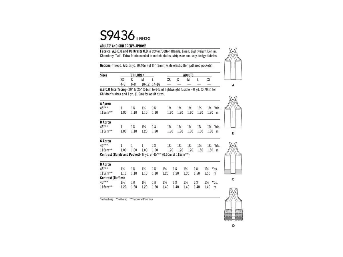 Simplicity Pattern S9436 ADULT & CHILD APRONS- Size A (XS – L / XS – XL) – is a standard printed tissue pattern (not downloadable). EVERYBODY IS IN THE KITCHEN WEARING CROSSBACK APRONS. GET CREATIVE W/ POCKETS, BANDS & RUFFLES. See the second image for back of the pattern packet which lists recommended fabric types, size chart and meterage required.