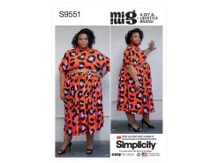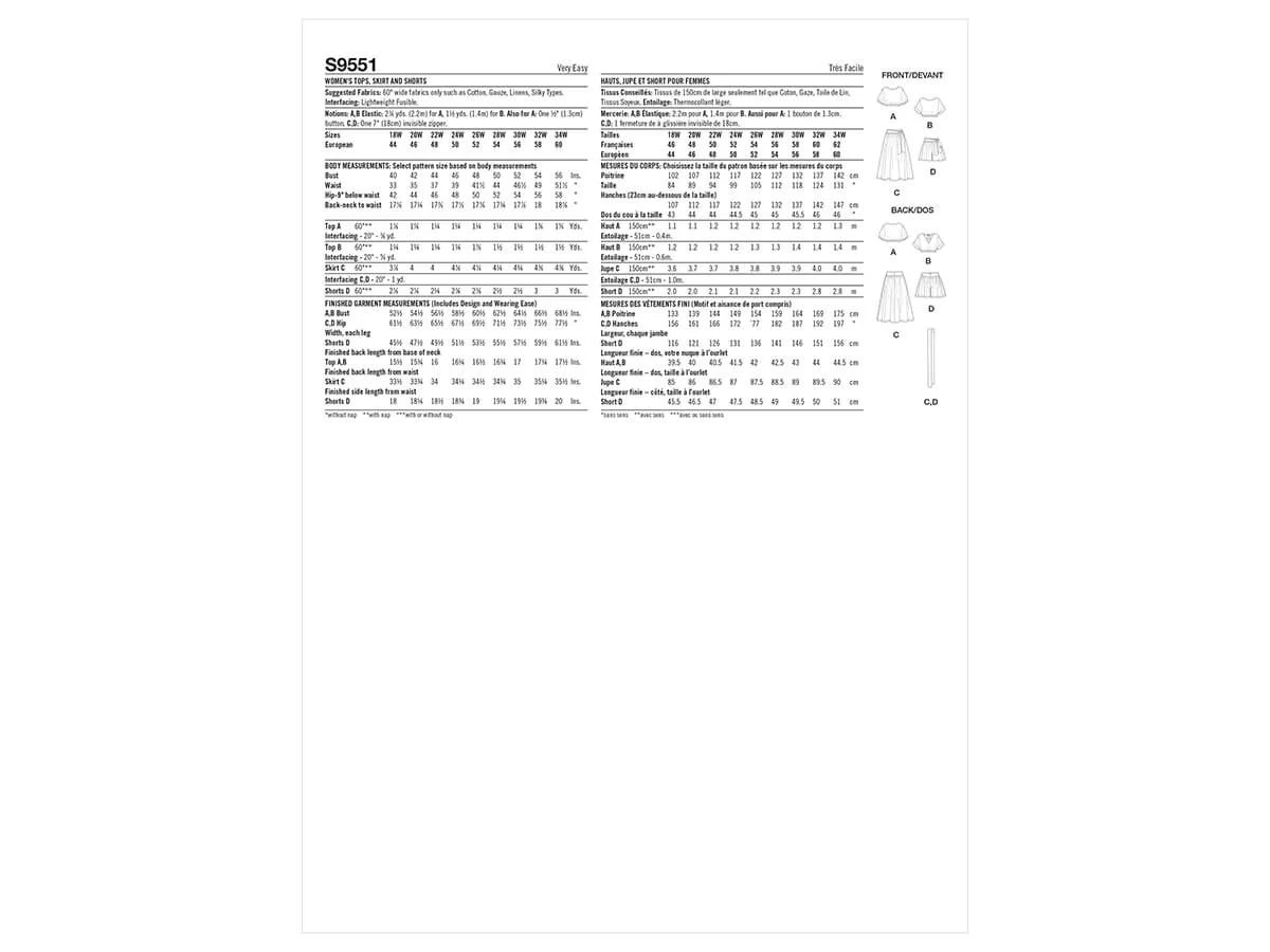 Simplicity Pattern S9551 Women’s Tops, Skirt and Shorts- Size G5 (26W-28W-30W-32W-34W) – is a standard printed tissue pattern (not downloadable). Women’s pull-over top has puffed dolman sleeves finished with elastic at hems and back button closure. View B top features short cuffed sleeves, elastic at hem and open V-back with self ties. Mid-calf skirt and mid-thigh shorts have back zipper, hip yoke and sash. Designed by Mimi G – Follow her for sewing tutorials.- Follow her for sewing tutorials. See the second image for back of the pattern packet which lists recommended fabric types, size chart and meterage required.