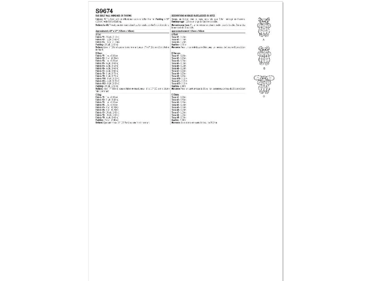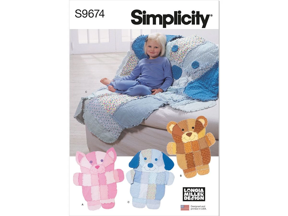 Simplicity Pattern S9674 RAG QUILT BY LONGIA MILLER- Size OS (ONE SIZE) – is a standard printed tissue pattern (not downloadable). Rag quilts designed for cozy flannel coordinates have appliqued faces and come in cat, bear or puppy shapes. Use them as throws, wall hangings or as thoughtful gifts. Quilts measure approximately 49″ (125cm) x 57″ (145cm). See envelope for more information. See the second image for back of the pattern packet which lists recommended fabric types, size chart and meterage required.