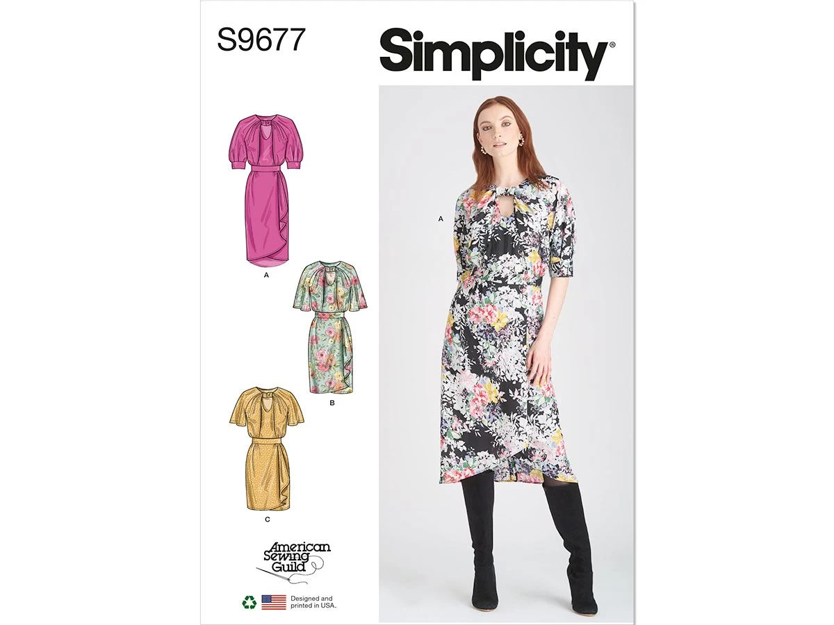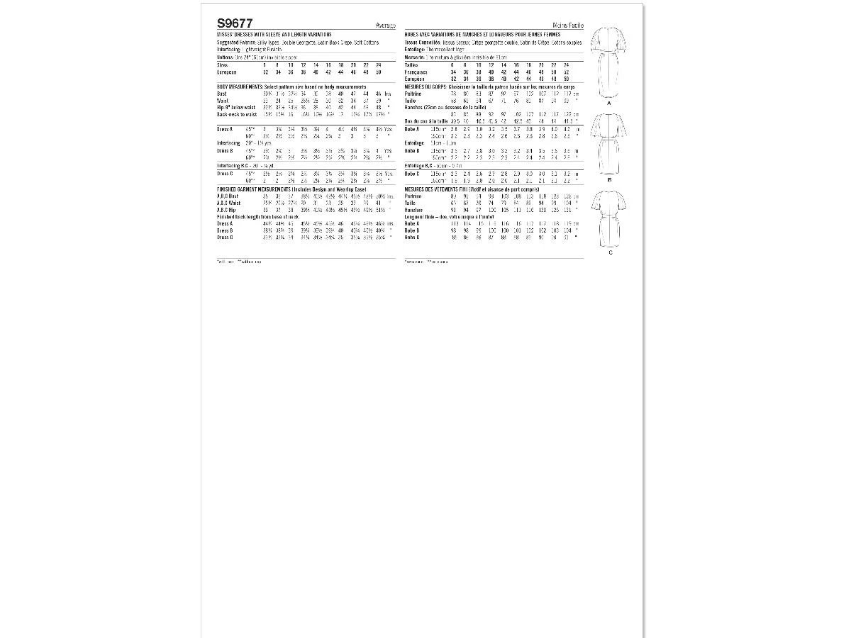 Simplicity Pattern S9677 MISSES’ DRESSES WITH SLEEVE AND LENGTH VARIATIONS- Size U5 (16-18-20-22-24) – is a standard printed tissue pattern (not downloadable). Dress features knotted draped bodice overlay, cutout neckline, waistband at skirt encased into side seam, and back zipper. View A is a long dress with pleated puff sleeves and sleeve bands. Views B and C have flutter sleeves. View C is a mini dress. Sales from this pattern help support American Sewing Guild dedicated to Advancing Sewing as an Art and Life Skill. Learn more at www.asg.org. See the second image for back of the pattern packet which lists recommended fabric types, size chart and meterage required.